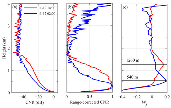 Doppler wind lidar observations at 14:00 (red) and 02:00 (blue) on 12 November 2023: (a) CNR (dB); (b) range-corrected CNR after normalization; and (c) wavelet covariance coefficient . The black solid lines indicate the height of the local maxima of , corresponding to the retrieved BLHs.