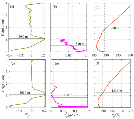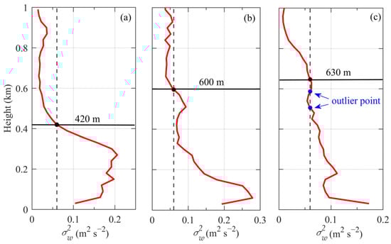 As shown in Figure 2a,b, the generally decreases with height, and the height where it first falls below the threshold is identified as the BLH. However, during certain periods, enhanced turbulent activity near the top of the boundary layer can cause multiple fluctuations of the variance around the threshold, resulting in several intersections with the threshold line (Figure 2c). To avoid misidentification caused by such fluctuations, the median method [47,59] was applied to remove abnormal points. Specifically, (1) all heights where is below the threshold are first selected; (2) then the median among these selected heights is calculated; (3) the final BLH is then determined as the highest level below the median where is greater than or equal to the threshold.