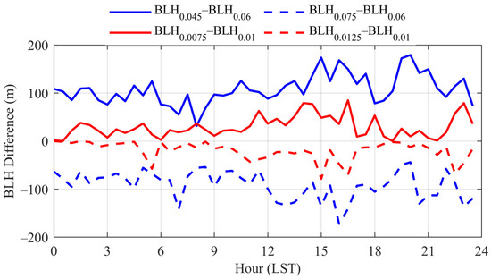 To verify the validity of the selected thresholds, we conducted a threshold sensitivity analysis to assess their impact on BLH retrieval under different weather conditions. We tested the robustness of the thresholds by varying them within a ±25% range for both clear-sky and cloudy/hazy days. Figure 3 shows the BLH differences under these conditions, with the vertical axis representing the average change in PBLH for each half-hour under different threshold settings. The solid and dashed lines in the figure represent the differences between adjacent thresholds, providing a clear comparison of how each threshold affects PBLH retrieval. Under clear-sky conditions, the differences between 0.045 m2 s−2 and 0.06 m2 s−2, as well as between 0.06 m2 s−2 and 0.075 m2 s−2, show a consistent pattern, demonstrating that the 0.06 m2/s2 threshold provides stable BLH retrieval results. Similarly, for cloudy and hazy conditions, the differences between 0.0075 m2/s2 and 0.01 m2 s−2, as well as between 0.01 m2 s−2 and 0.0125 m2 s−2, show relatively smaller fluctuations, with differences ranging from −100 m to 100 m, indicating that the 0.01 m2 s−2 threshold is equally stable and effective. Overall, the minimal variations observed in BLH differences across different weather conditions suggest that the chosen thresholds—0.06 m2 s−2 for clear-sky conditions and 0.01 m2 s−2 for cloudy/hazy conditions—are robust and provide consistent results. The variations in thresholds within the ±25% range did not lead to significant changes in the retrieval results, further confirming the suitability of the selected thresholds for BLH assessment.