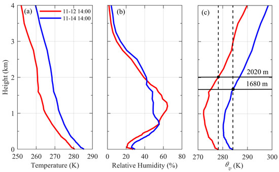Schematic illustration of BLH retrieval using the parcel method at 14:00 on 12 November 2023 (red) and 14:00 on 14 November 2023 (blue): (a) temperature profiles; (b) relative humidity profiles; (c) virtual potential temperature profiles. The black dashed line indicates the surface virtual potential temperature , while the red and blue solid lines represent the profiles at the corresponding times. The black dots mark the levels where θv equals θvs, and the black solid lines denote the identified BLHs.