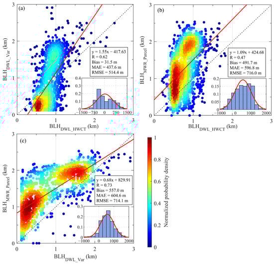 Correlation analysis of three BLH retrieval methods during daytime hours (09:00–17:00 LST): (a) variance method (DWL_Var) vs. Haar wavelet covariance transform (DWL_HWCT); (b) parcel method (MWR_Parcel) vs. DWL_HWCT; (c) MWR_Parcel vs. DWL_Var. The color of the scatter points represents the normalized probability density. The red line denotes the linear regression fit, and the black dashed line indicates the 1:1 reference. The regression equation, correlation coefficient (R), mean bias (Bias), mean absolute error (MAE), and root-mean-square error (RMSE) are also shown in each panel. The inset in the lower right corner of each plot presents the frequency histogram of retrieval differences, with the red line indicating the fitted curve.