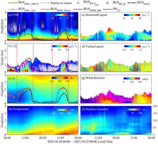 Multi-source observational profiles under clear-sky conditions at the observation site on 20–21 October 2023: (a) CNR; (b) ; (c) virtual potential temperature ; (d) temperature; (e) horizontal wind speed; (f) vertical wind speed; (g) wind direction; and (h) relative humidity and PM2.5 concentration. The green, pink, and orange lines represent BLHs retrieved from HWCT method, variance method, and parcel method, respectively, while the gray solid line denotes the nighttime stable-layer height obtained from SBI method. The triangles and pentagrams indicate BLHs derived from improved potential temperature gradient method and Richardson number method, respectively. The black dashed line shows the BLH from ERA5 data, the purple solid line indicates PM2.5 concentration (corresponding to the right y-axis in panel (h)), and the red dashed lines mark sunrise and sunset times.