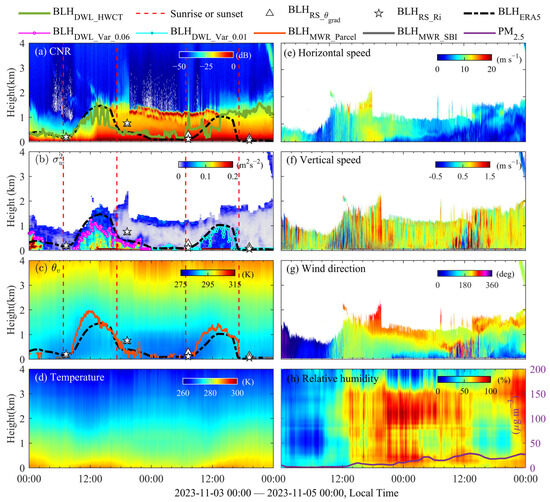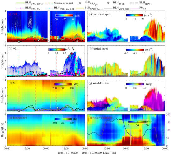 Multi-source observational profiles under cloudy conditions at the observation site on 01–02 November 2023: (a) CNR; (b) ; (c) virtual potential temperature ; (d) temperature; (e) horizontal wind speed; (f) vertical wind speed; (g) wind direction; (h) relative humidity and PM2.5 concentration. The green, pink, blue, and orange solid lines represent BLHs retrieved from HWCT method, variance method with thresholds of 0.06 m2 s−2 and 0.01 m2 s−2, and parcel method, respectively. The gray solid line denotes the nighttime stable-layer height obtained from the SBI method. The triangles and pentagrams indicate BLHs derived from improved potential temperature gradient method and Richardson number method, respectively. The black dashed line shows the BLH from ERA5 data, the purple solid line indicates PM2.5 concentration (corresponding to the right y-axis in panel (h)), and the red dashed lines mark sunrise and sunset times.