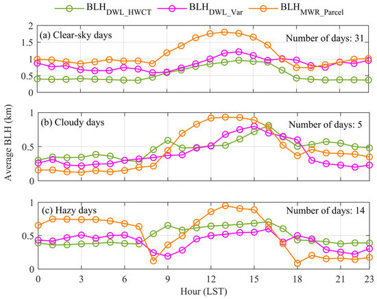 Under such persistent clear-sky conditions, the BLHs retrieved from the three methods (, and ) all exhibited pronounced diurnal variations.