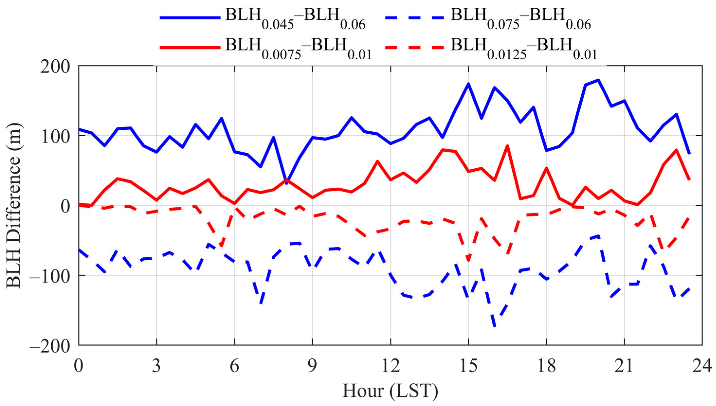 - Zhou, Y.; Han, Y.; Hu, Z.; Zhou, Q.; Liu, Y.; Dong, L.; Xiao, P. Characteristics of Planetary Boundary Layer Height (PBLH) over Shenzhen, China: Retrieval Methods and Air Pollution Conditions. Remote Sens. 2025, 17, 3937. [Google Scholar] [CrossRef]