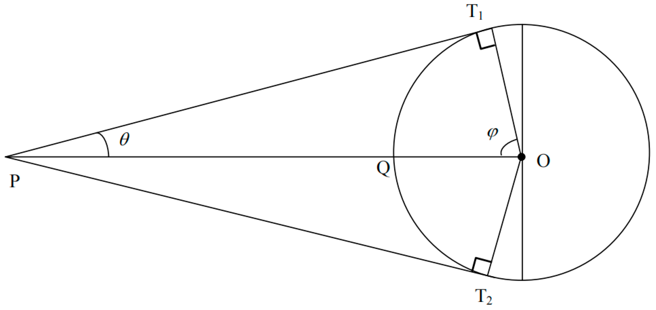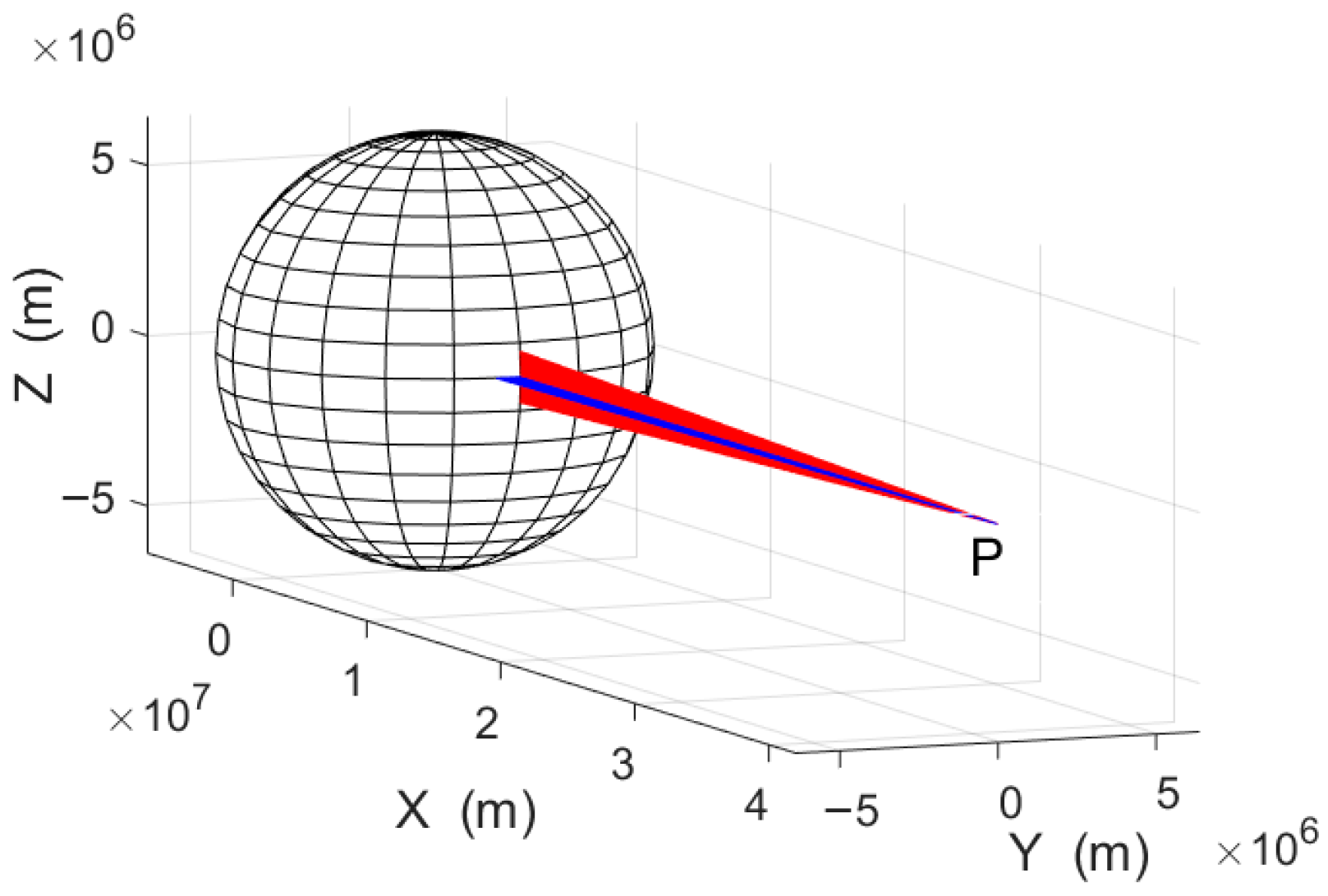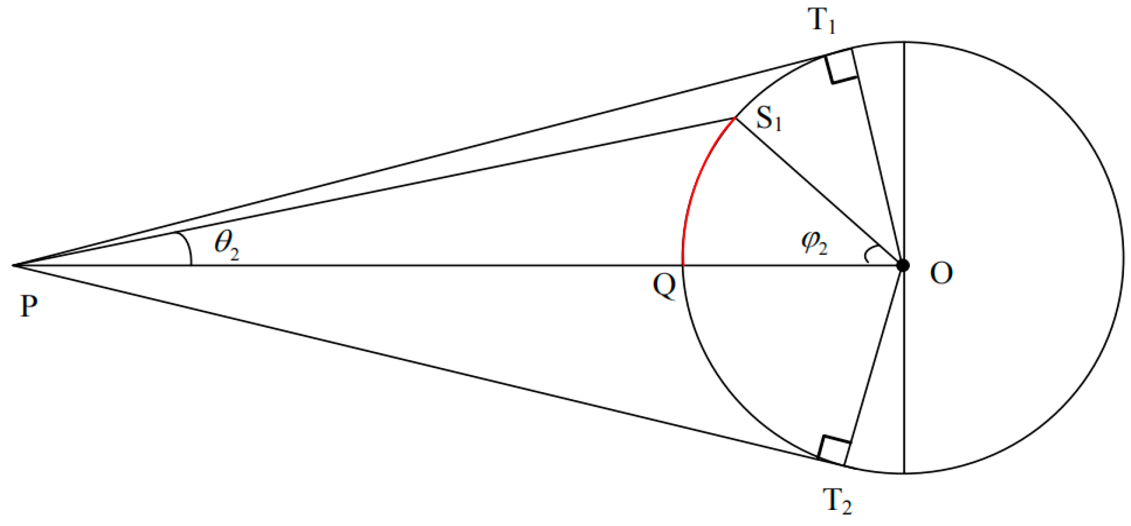 Figure 2, the center of the sphere is denoted as O, and P is the GEO target. The line connecting O and P intersects with the Earth’s surface at point Q. In this 2D plane, the two tangents to the Earth drawn from target P contact the Earth at points T1 and T2, respectively. Therefore, the observable arc on the Earth’s surface for target P is defined as the segment T1-Q-T2. The distance OQ is equal to the Earth’s radius, while the distance OP equals the sum of the Earth’s radius and the geostationary orbit altitude. Based on this geometry, the angle T