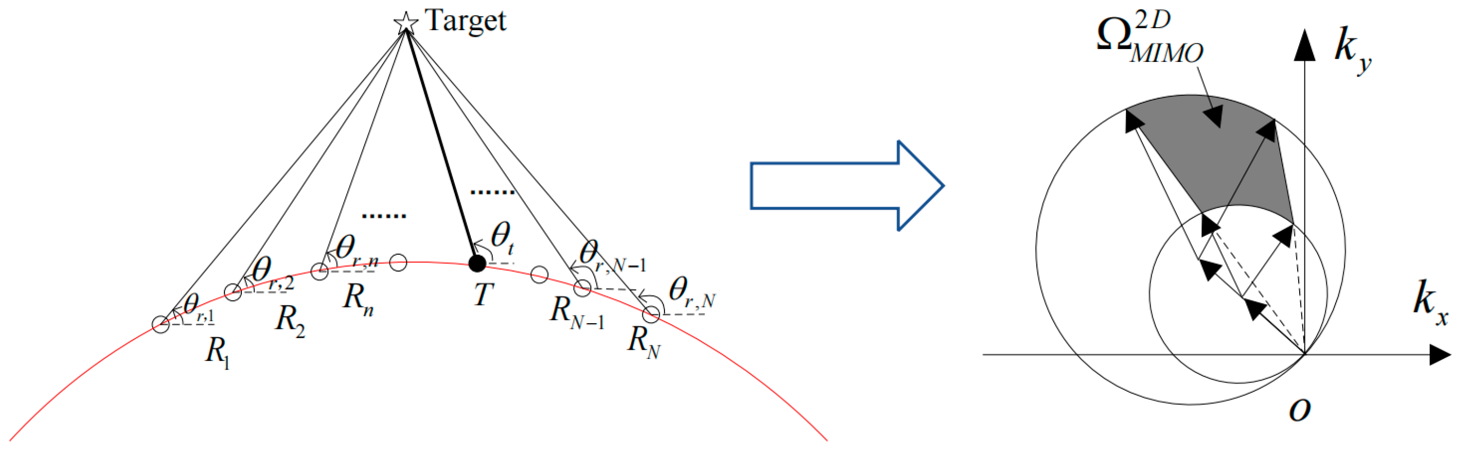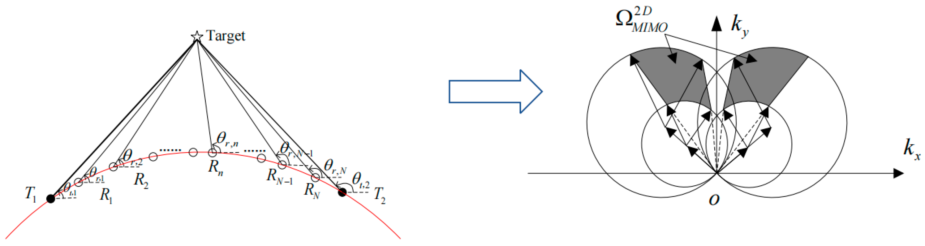 28]. Ground-based radar imaging of GEO targets operates in the near-field regime. And the PCA (phase center approximation) method, which assumes far-field conditions, does not apply for analyzing the performance of such MIMO arrays. Therefore, we conduct the analysis from the perspective of wavenumber support. This method is applicable to the near-field resolution analysis of SAR and MIMO arrays.