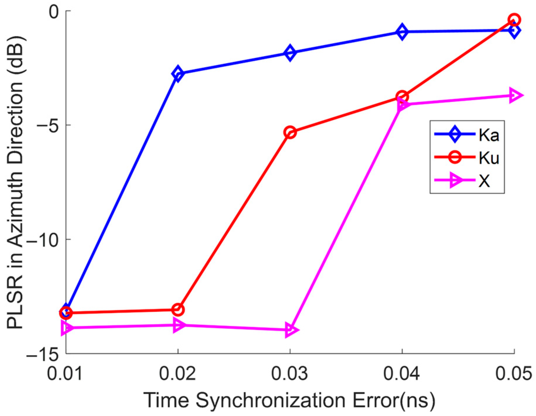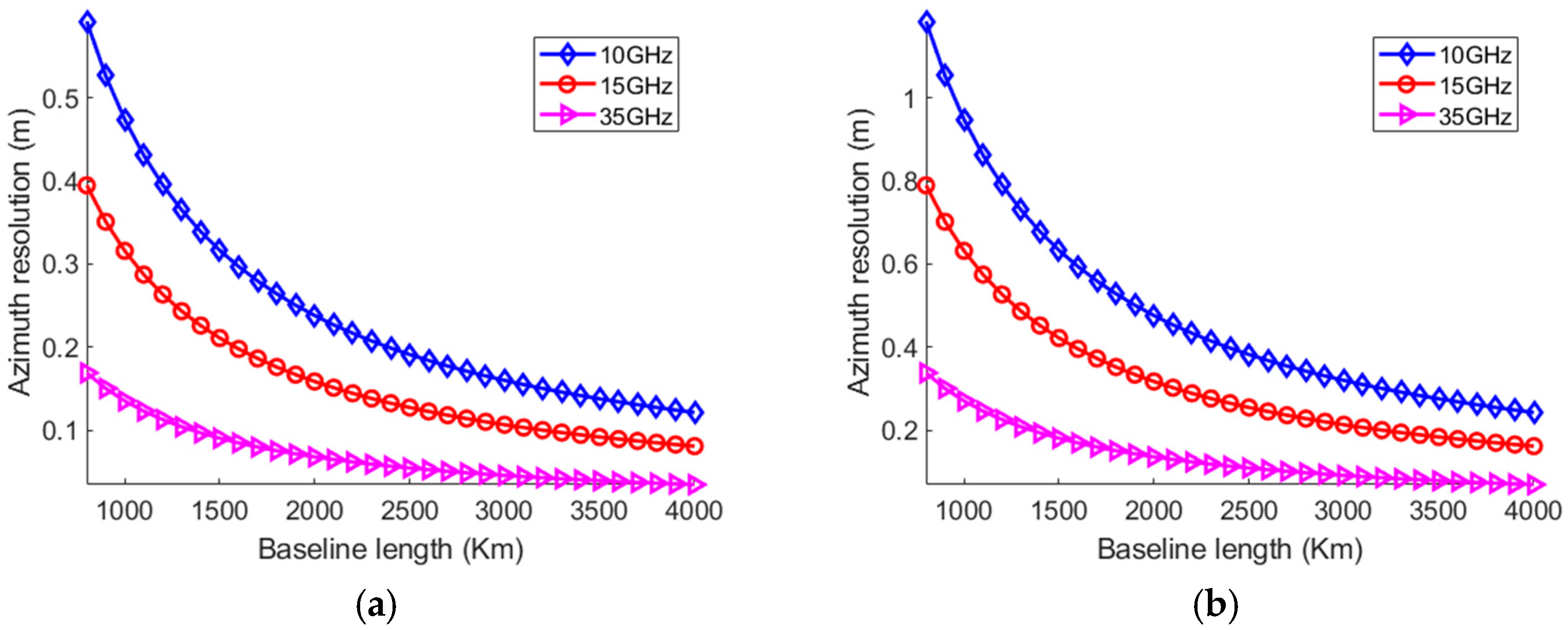 Figure 7, the value of the theoretical azimuth resolution decreases as the baseline length increases from 800 km to 4000 km. For the Ends-Transmitting and Multiple-Receiving array configuration, when the transmitting signal center frequency is 10 GHz, the theoretical resolution corresponding to baseline length of 1000 km, 2000 km, and 3000 km is 0.47 m, 0.24 m, and 0.16 m, respectively. When the center frequency is 15 GHz, the azimuth resolution corresponding to same baseline length is 0.32 m, 0.16 m, and 0.11 m, respectively. When the center frequency is 35 GHz, the corresponding resolution further improves to 0.14 m, 0.07 m, and 0.05 m, respectively.