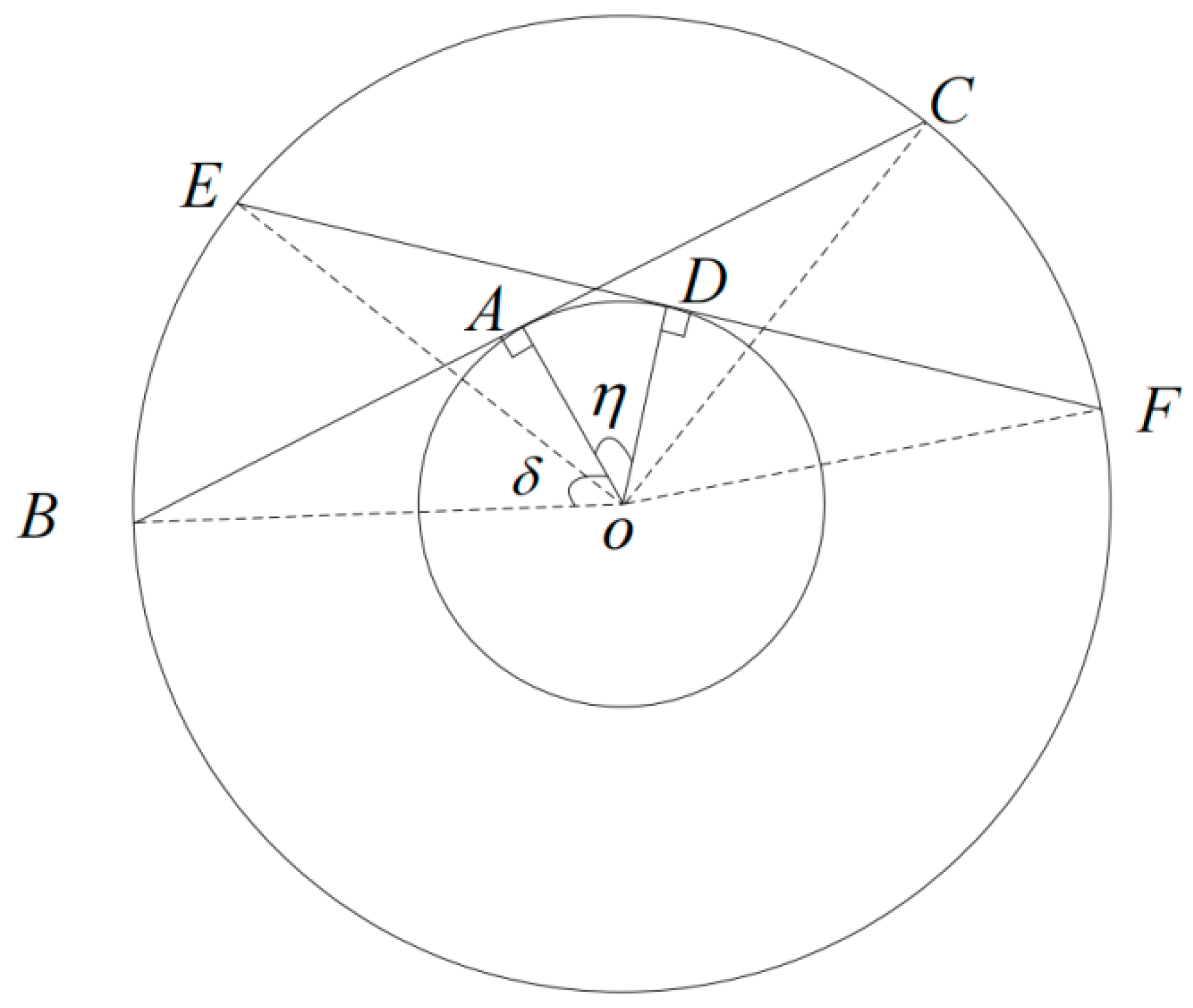 Figure 9 shows a cross-sectional view of the equatorial plane, where O represents the Earth’s center (and also the center of the geostationary orbit). Point A lies on the Earth’s surface. The lines tangent from A to the Earth intersect the geostationary orbit at points B and C, respectively. The arc BC corresponds to the spatial coverage observable by a radar located at A. With OA equal to the Earth’s radius and OB equal to the geostationary orbital radius, the central angle ∠BOC is calculated as