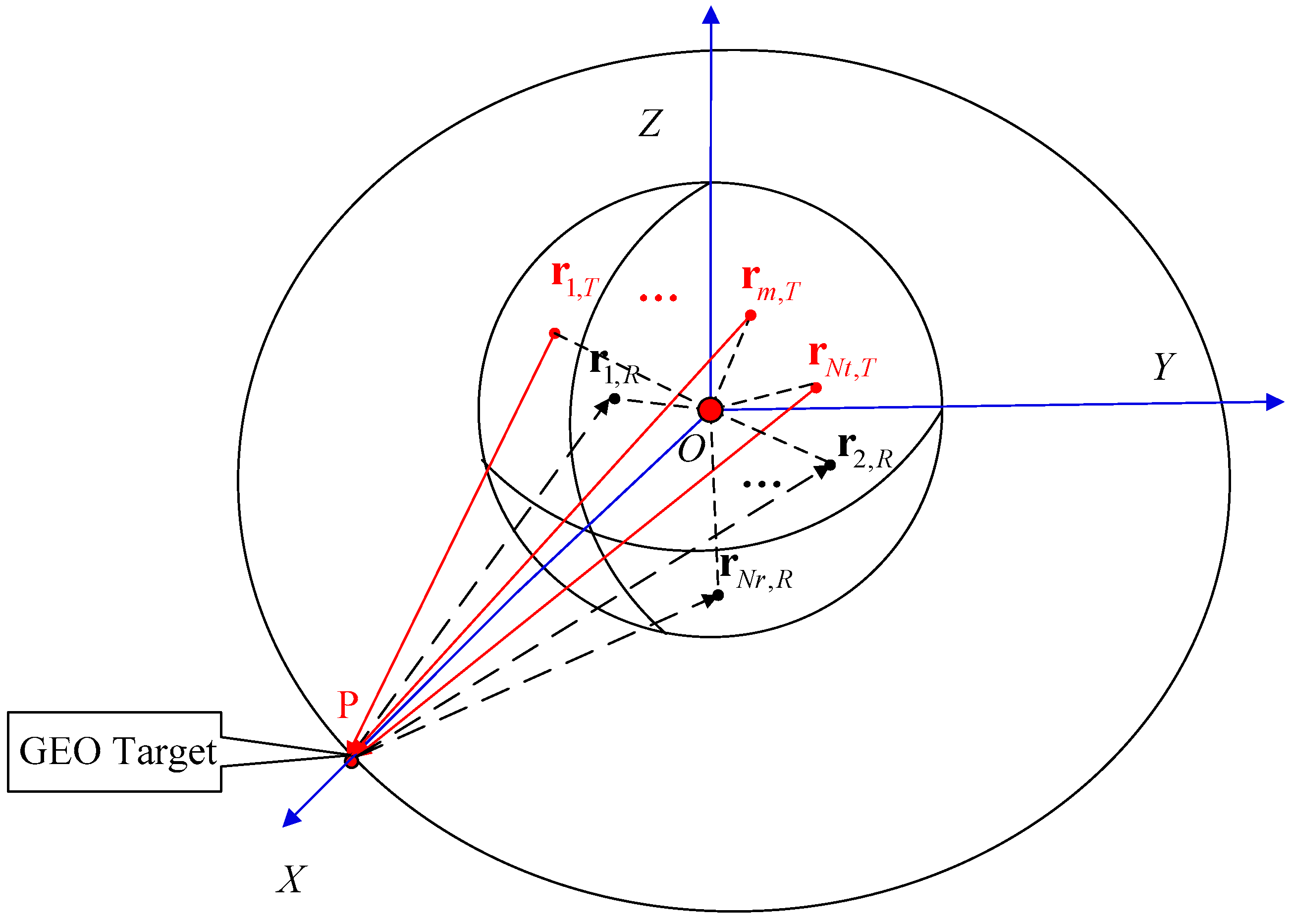 During the transmitting and receiving time of ground-based MIMO radar, the target is assumed to be stationary, meaning its coordinate position remains unchanged. The coordinate of the m-th transmitting antenna is denoted as , where the subscript indicates the transmitting antenna, the subscript m is the index of the antenna , and is the total number of transmitting antennas. The coordinate of the n-th receiving antenna is denoted as , where the subscript R indicates the receiving antenna, the subscript n is the index of the antenna , and is the total number of receiving antennas. represents the coordinates of a specific scattering point P on the GEO target.