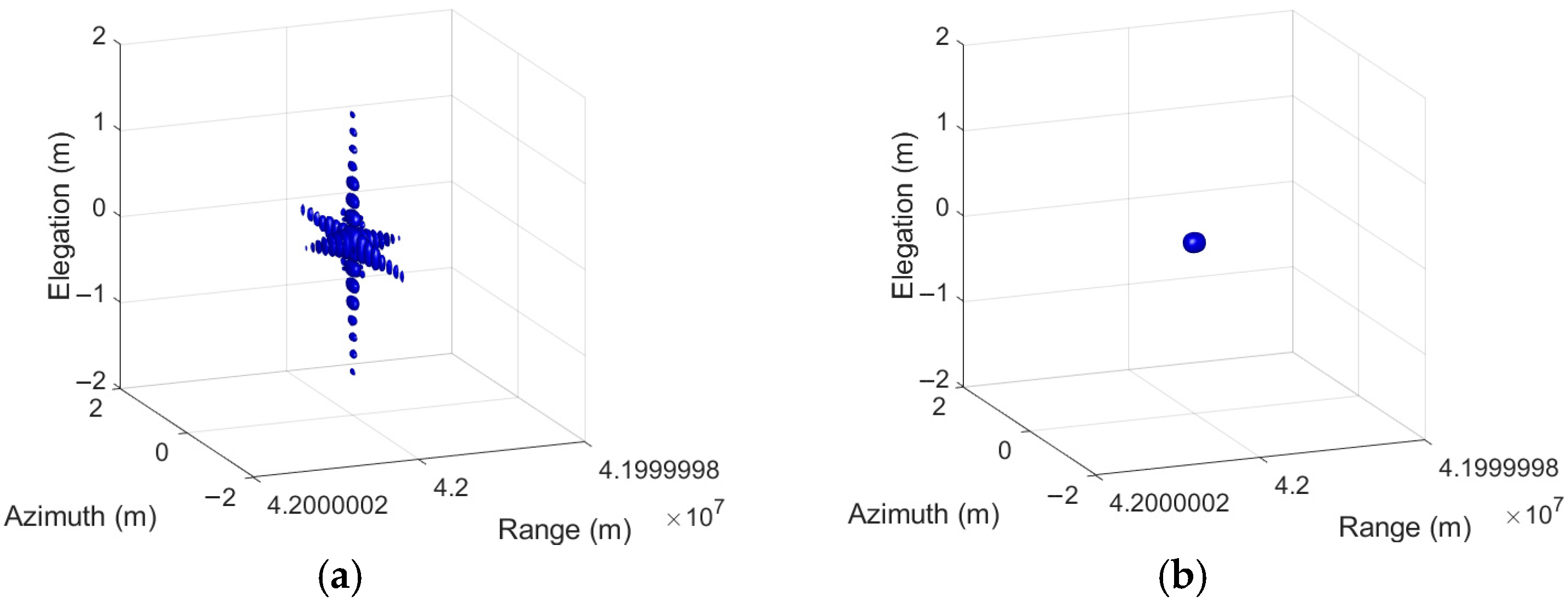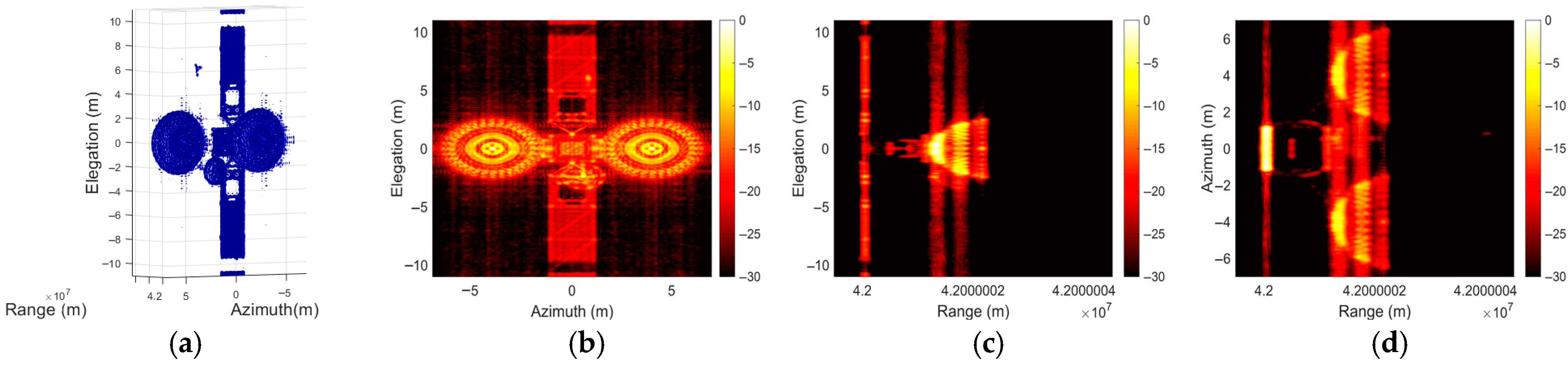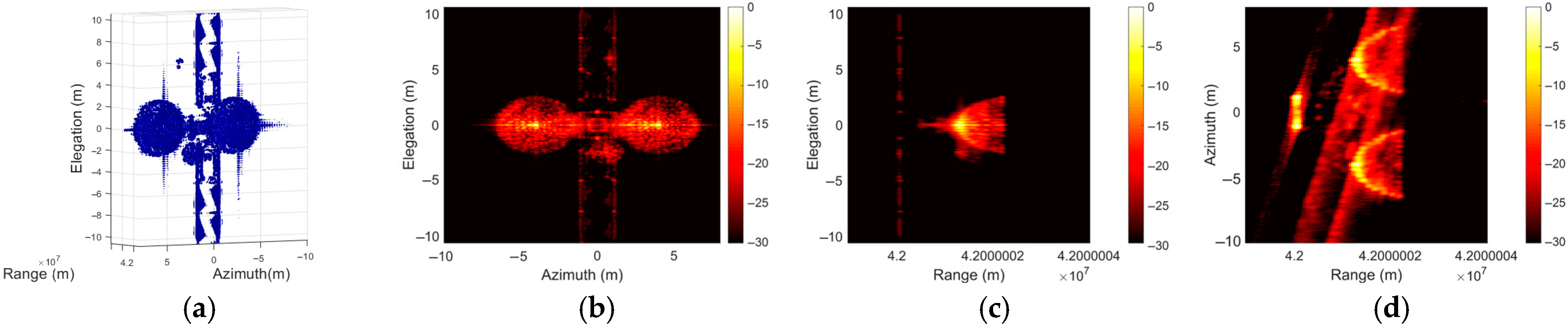 Section 4 presents the simulation results and analysis, including point targets and satellite models. Beyond validating the ideal imaging performance, this section further investigates the influence of key system parameters (e.g., baseline length and element spacing) on imaging quality and evaluates the system’s sensitivity to practical non-idealities such as synchronization errors and ionospheric effects. Finally,