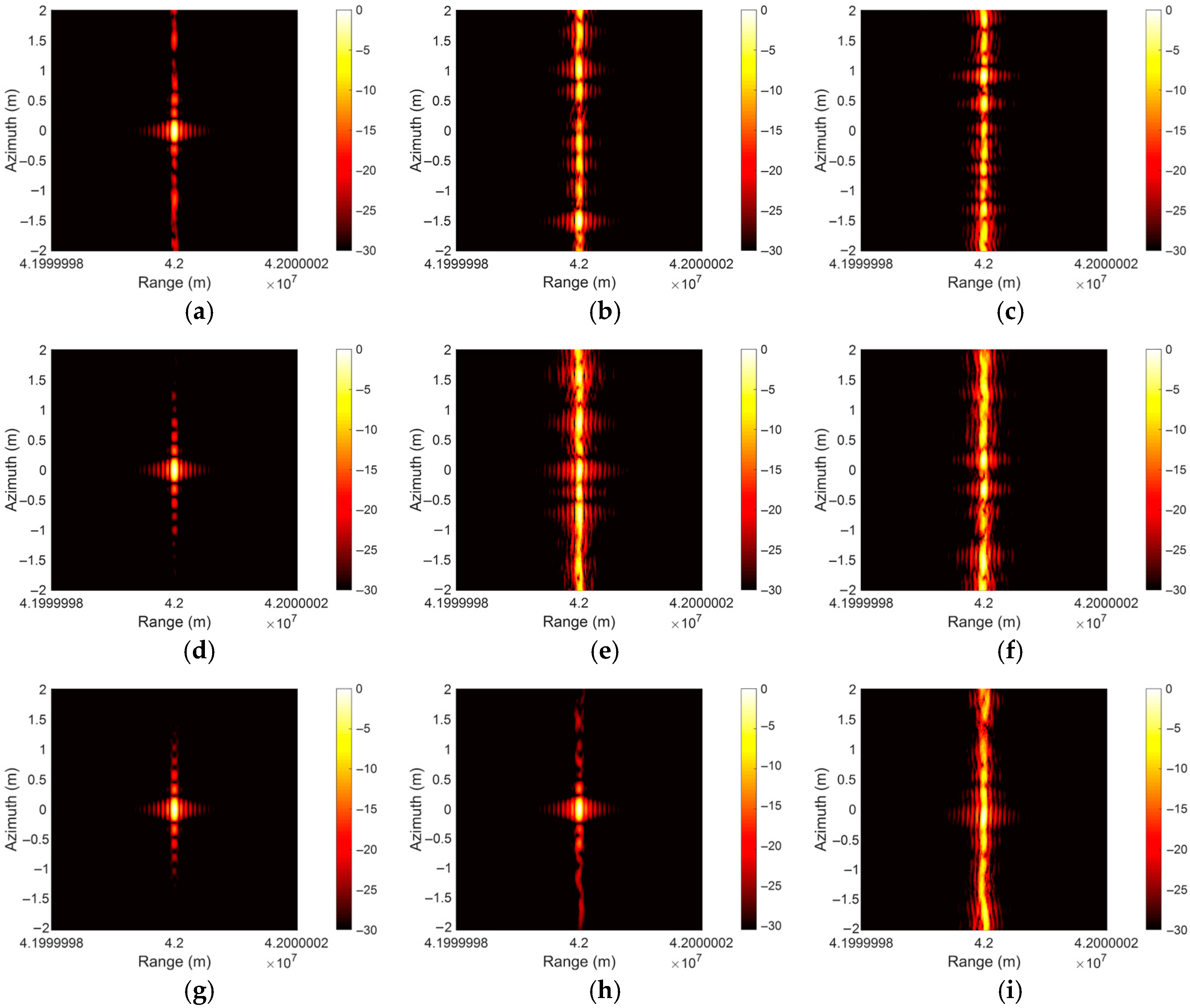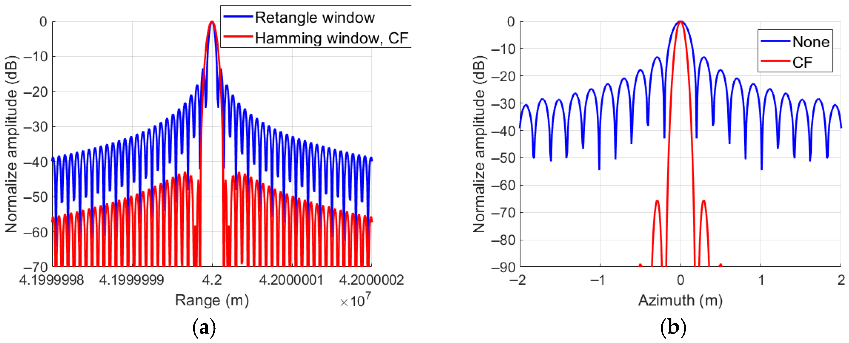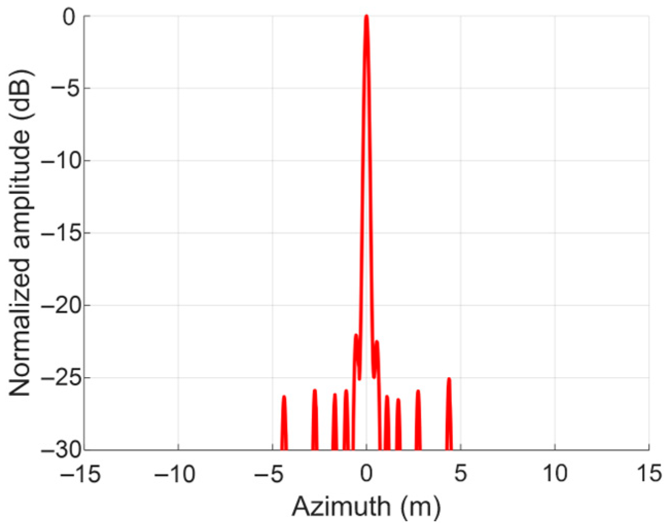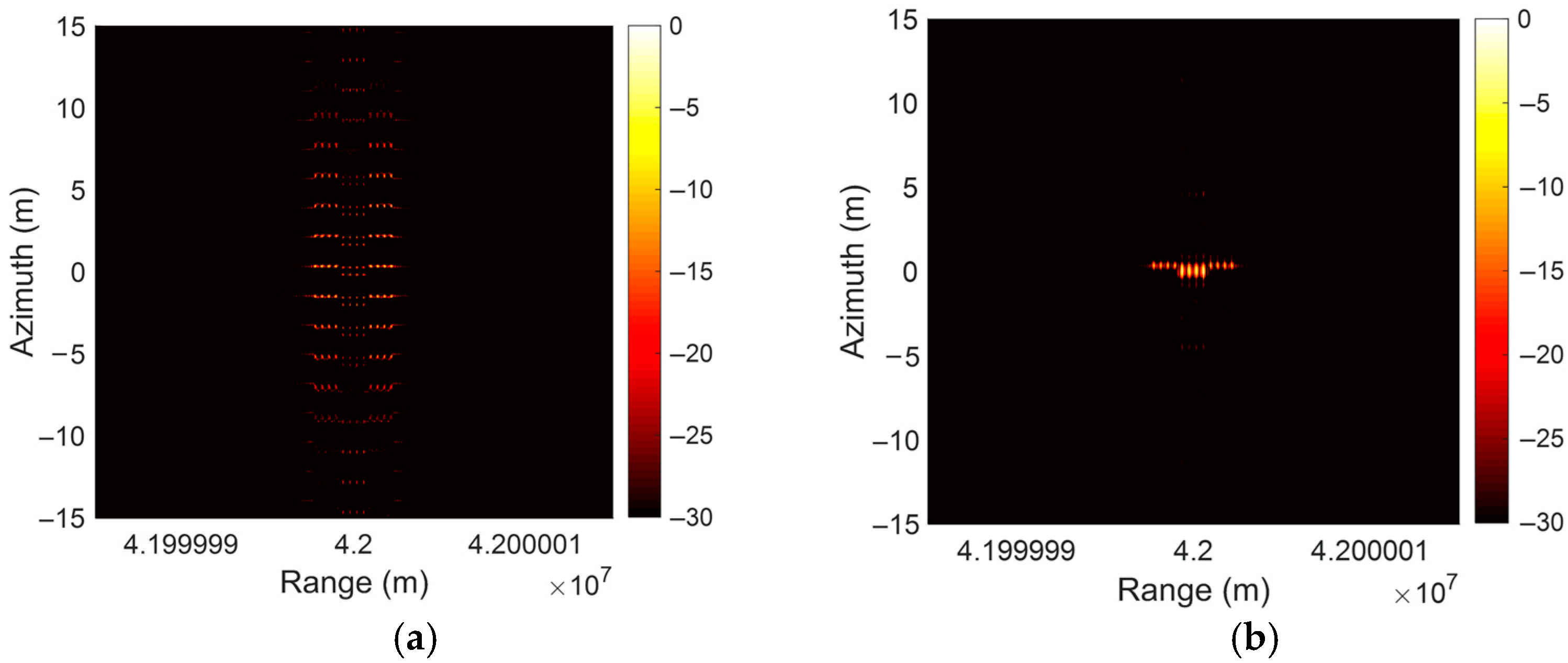 Figure 8 do not account for azimuth windowing or processing techniques such as CF weighting. The above analysis demonstrates that, when the center frequency is 35 GHz and baseline length is 2000 km, the Ends-Transmitting and Multiple-Receiving array’s theoretical azimuth resolution is 0.07 m, while the One-transmitting and Multiple-Receiving array is 0.14 m. These results confirm the theoretical feasibility of imaging GEO targets using ground-based MIMO radar.