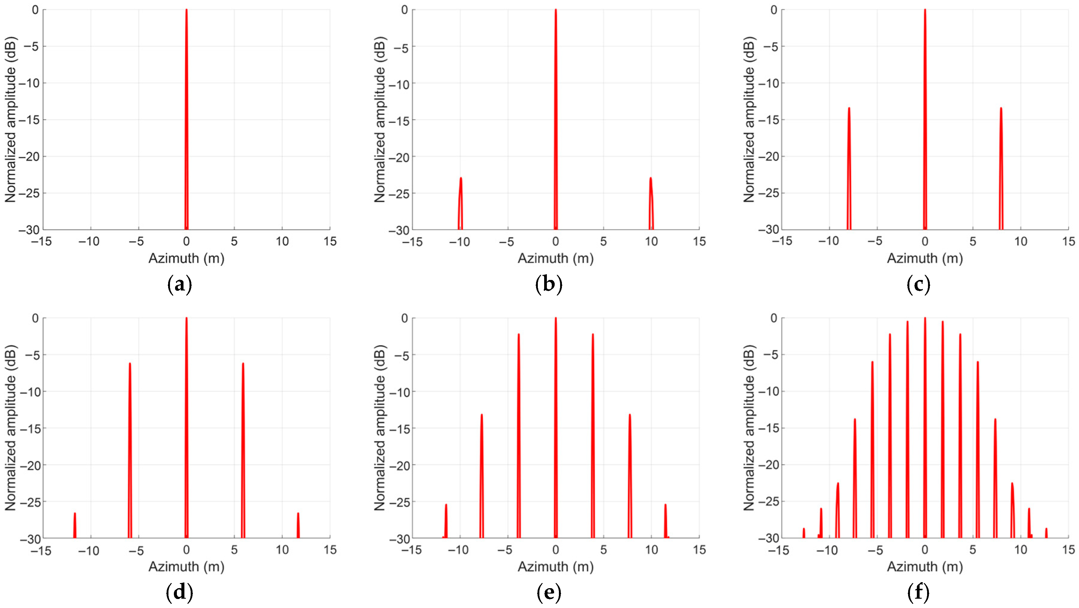 For the One-Transmitting and Multiple-Receiving array configuration, the absence of half the wavenumber support results in a degraded resolution under identical aperture lengths. Specifically, when the center frequency is 10 GHz, the theoretical resolution corresponding to three baseline lengths is 0.95 m, 0.48 m, and 0.32 m, respectively. When the center frequency is 15 GHz, the theoretical resolution is 0.63 m, 0.32 m, and 0.21 m, respectively. When the center frequency is 35 GHz, the theoretical resolution is 0.27 m, 0.14 m, and 0.09 m, respectively.