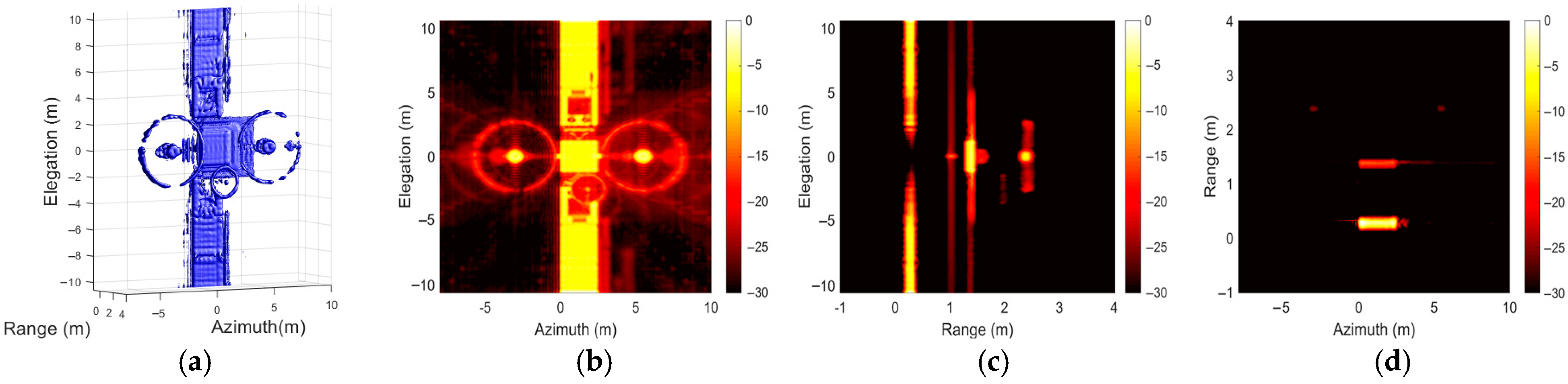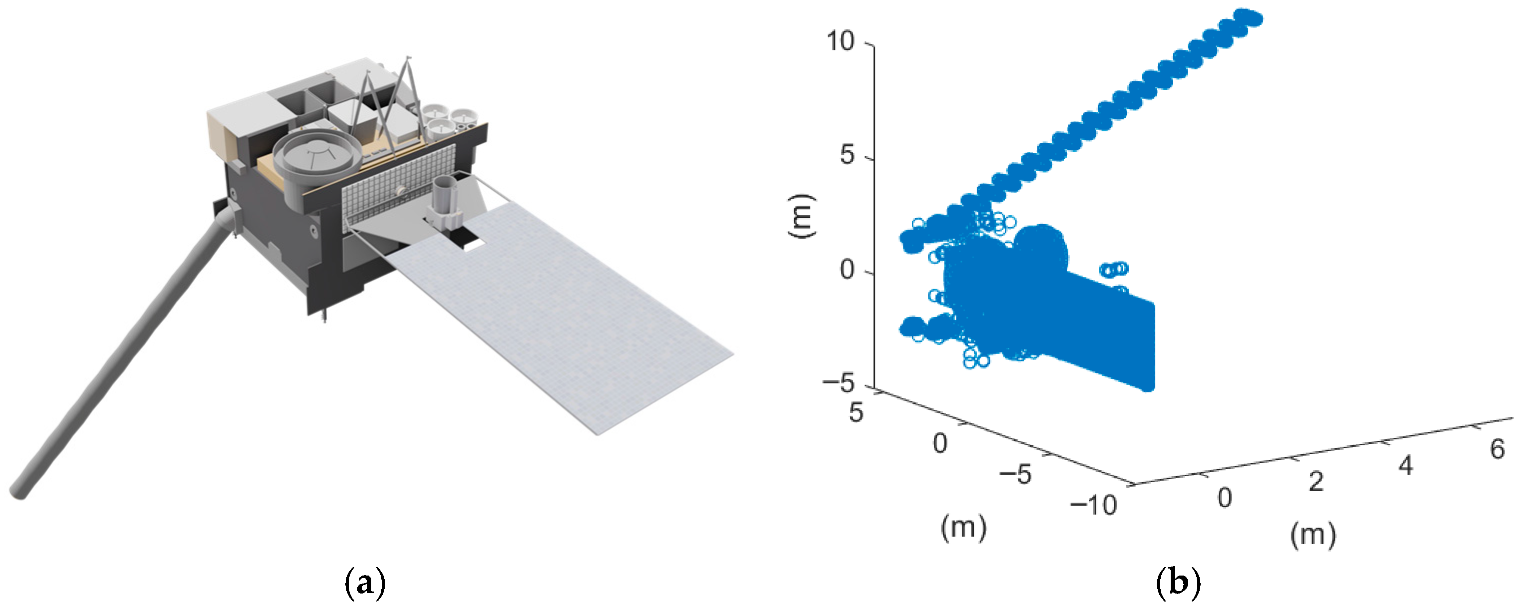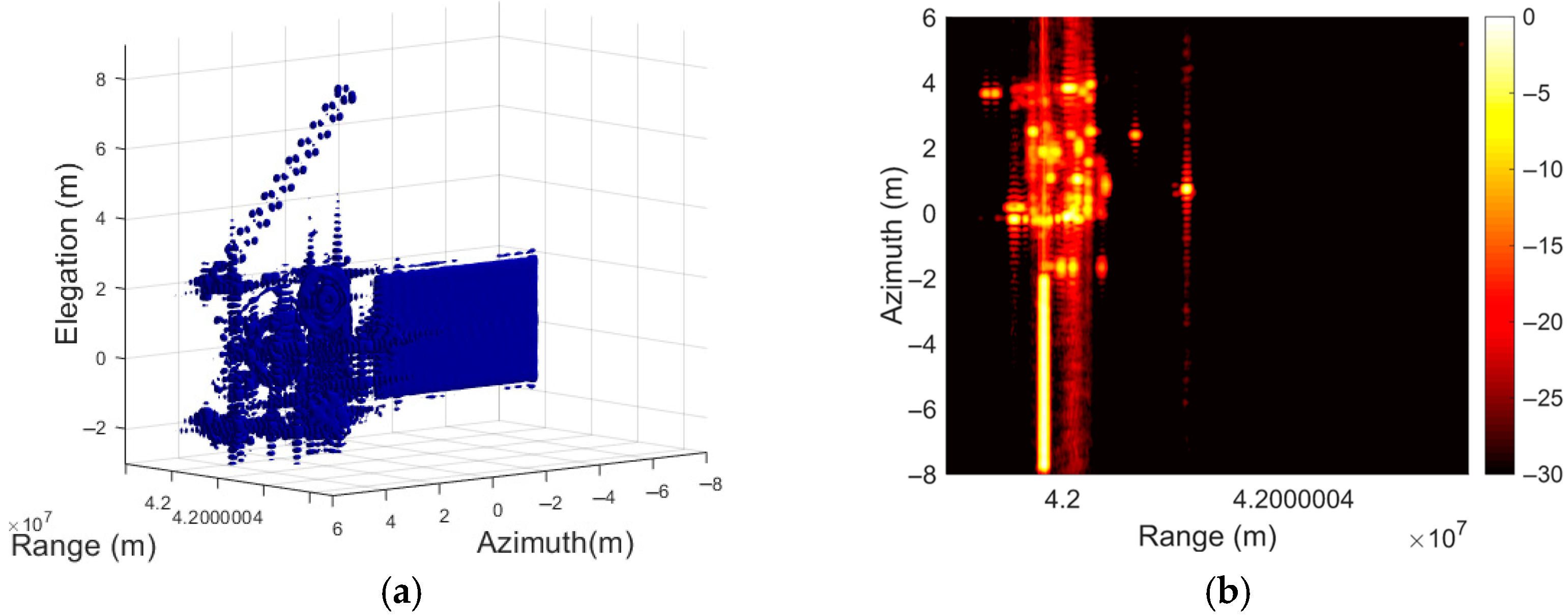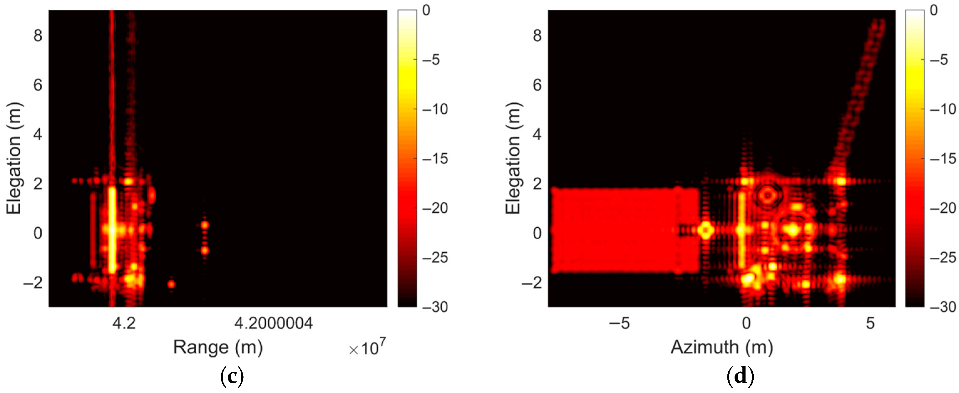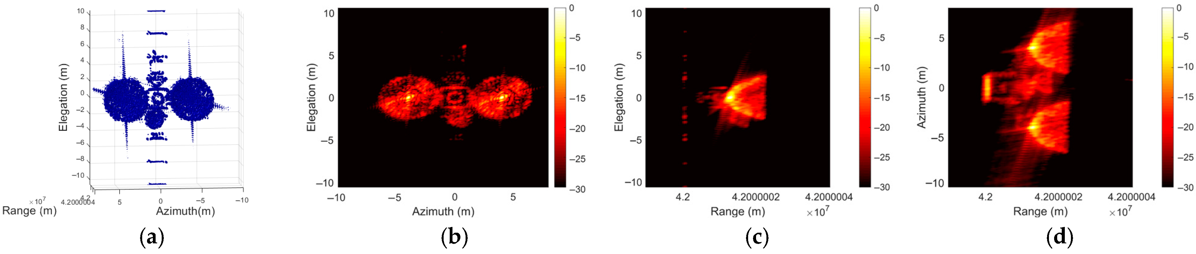 8]. Due to the constraint of the radar power–aperture product, the signal-to-noise ratio in space-based ISAR imaging systems is relatively low, leading to poor imaging quality. Ground-based radar systems are capable of detecting space targets and performing ISAR imaging with relative motion. A two-dimensional ISAR image represents the projection of the target onto the range-Doppler imaging plane. Consequently, when the imaging plane changes significantly, the two-dimensional ISAR images of the same target can vary considerably. In contrast, three-dimensional (3D) ISAR imaging can extract more comprehensive information such as the spatial structure, size, shape, and motion posture of the target. Based on different imaging principles, 3D ISAR imaging methods can primarily be categorized into two categories: one combines ISAR imaging techniques with interferometric techniques [