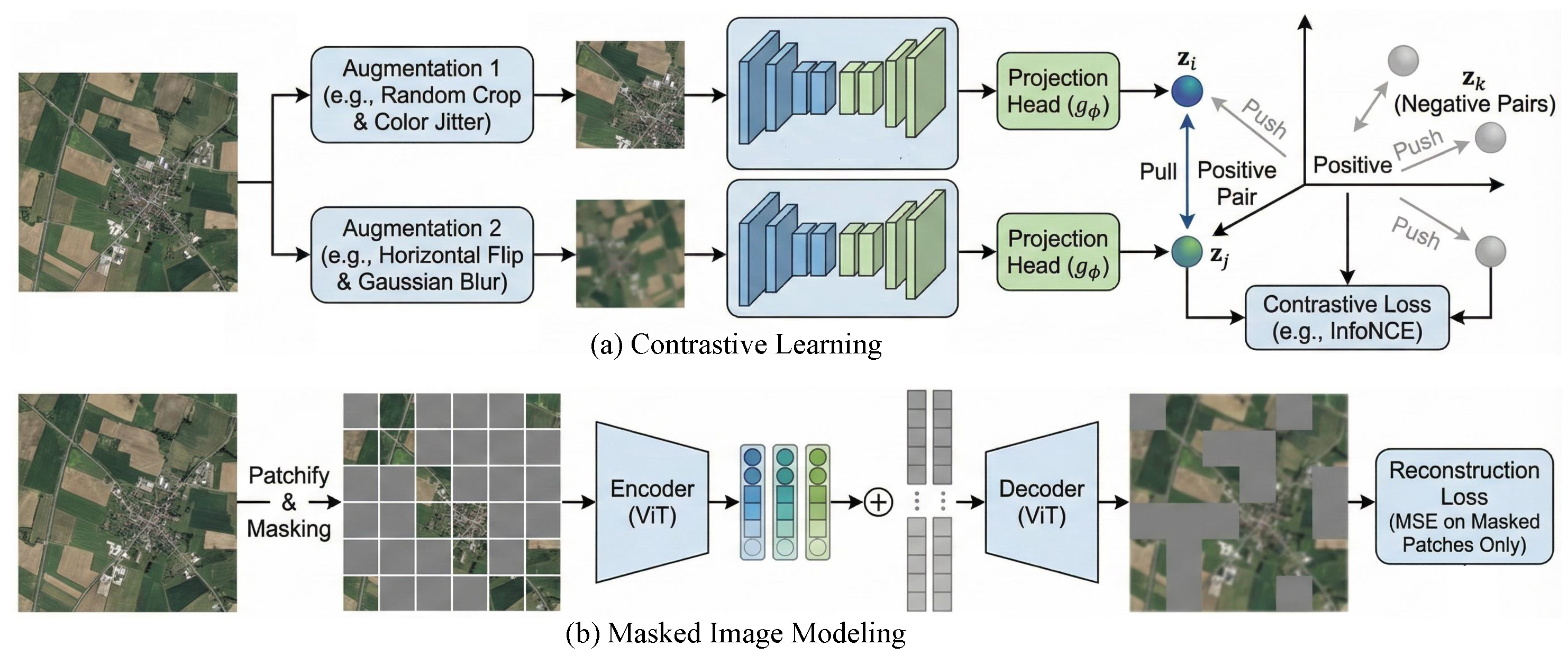 144], which are hard to obtain in RS due to the high cost of expert labeling. To leverage the massive volumes of unlabeled Earth observation data, self-supervised learning, typically involving contrastive learning (Contrastive) and masked image modeling (MIM), as shown in