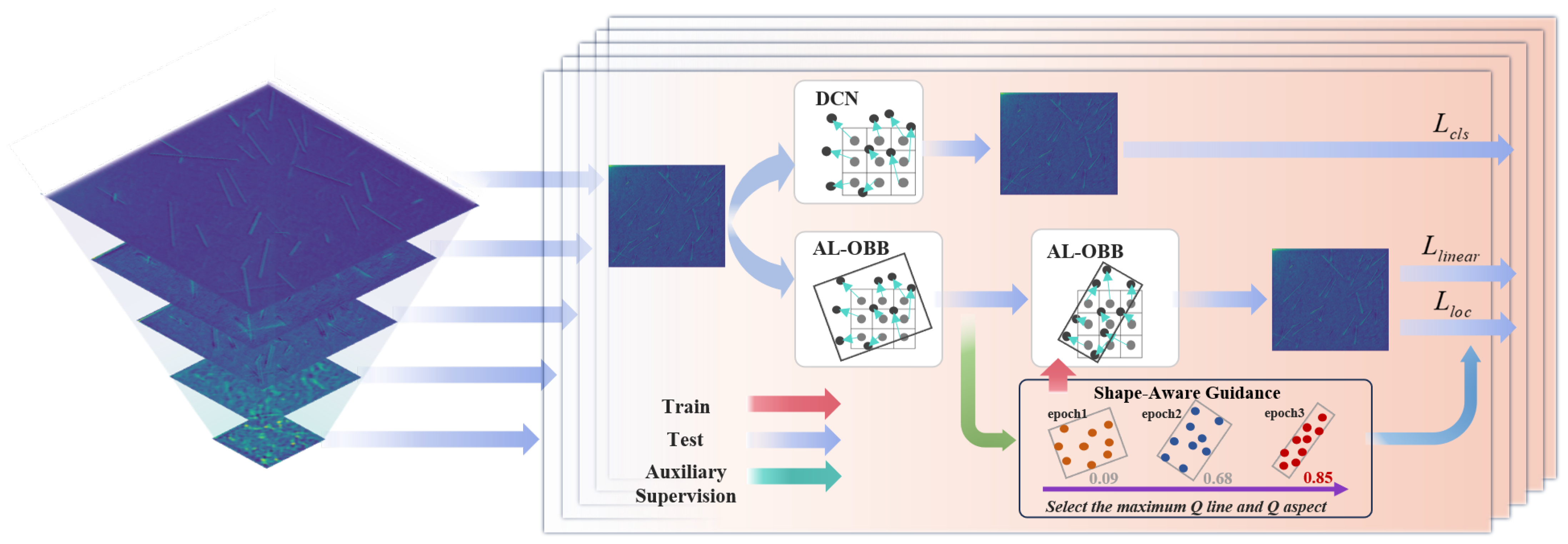 - We propose an Adaptive Linear Oriented Bounding Box (AL-OBB) head. By formulating a joint geometric constraint mechanism via collinearity and aspect ratio, this strategy achieves precise target separation and localization, effectively resolving ambiguities in dense and intersecting scenarios.