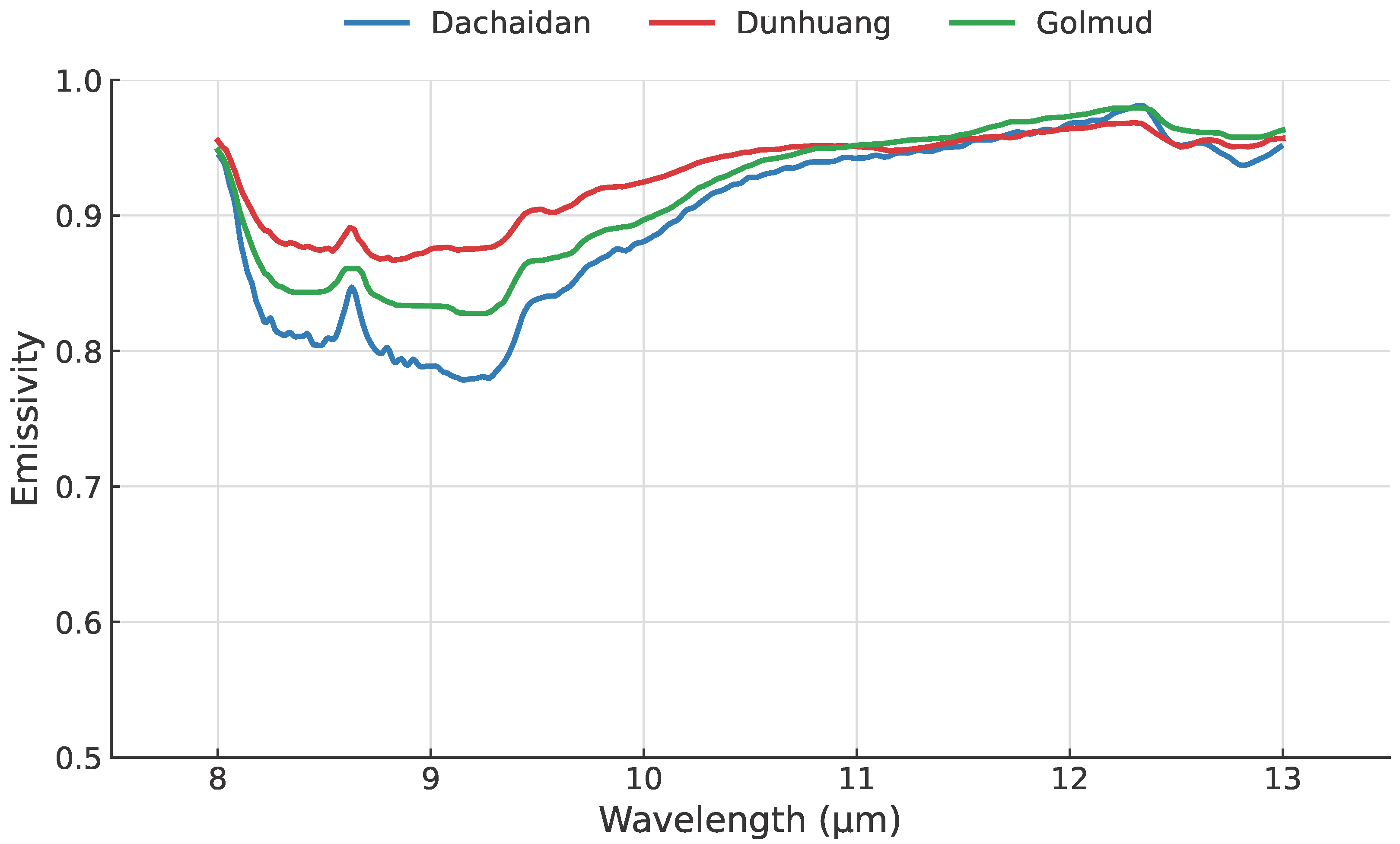 Surface emissivity was measured in the field using a portable Fourier-transform infrared spectrometer. As defined by Equation (