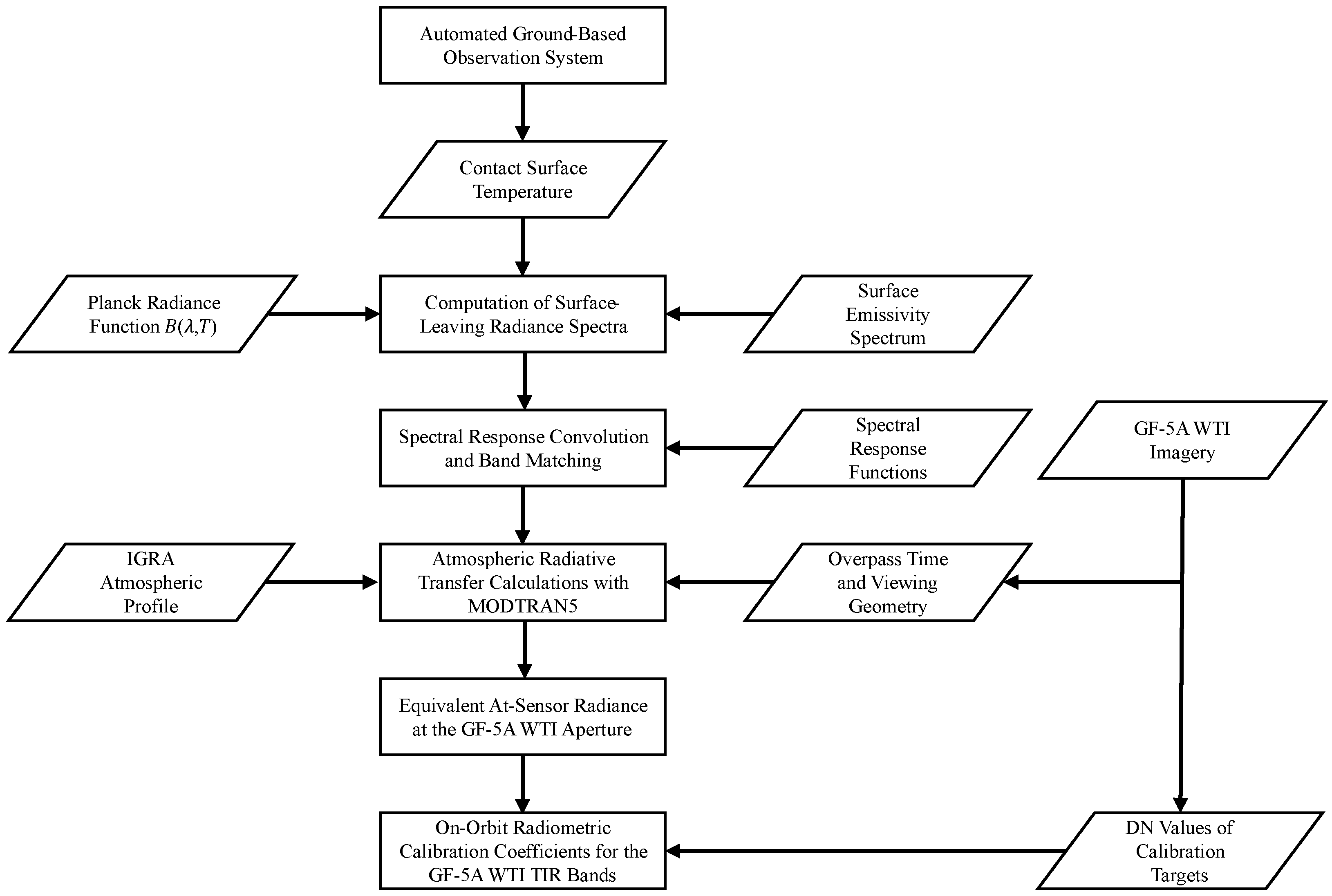 To address this gap and to develop a long-term, low-maintenance, and traceable TIR calibration framework, we deployed automated ground-based observation systems at three Gobi sites in October 2023 and initiated a dedicated field experiment for GF-5A WTI. The framework integrates continuous contact surface-temperature measurements, field-measured emissivity spectra, radiosonde atmospheric profiles, and MODTRAN v5.2 radiative-transfer simulations to construct a complete surface–atmosphere–sensor radiometric chain. Using this chain, top-of-atmosphere radiances are computed, collocated with satellite observations, and used to derive on-orbit calibration coefficients. Although previous studies have investigated TIR vicarious calibration, no multi-site, year-round automated system has been established over Gobi pseudo-invariant calibration surfaces. The present work provides the first implementation of such a system and demonstrates its feasibility for routine TIR calibration.