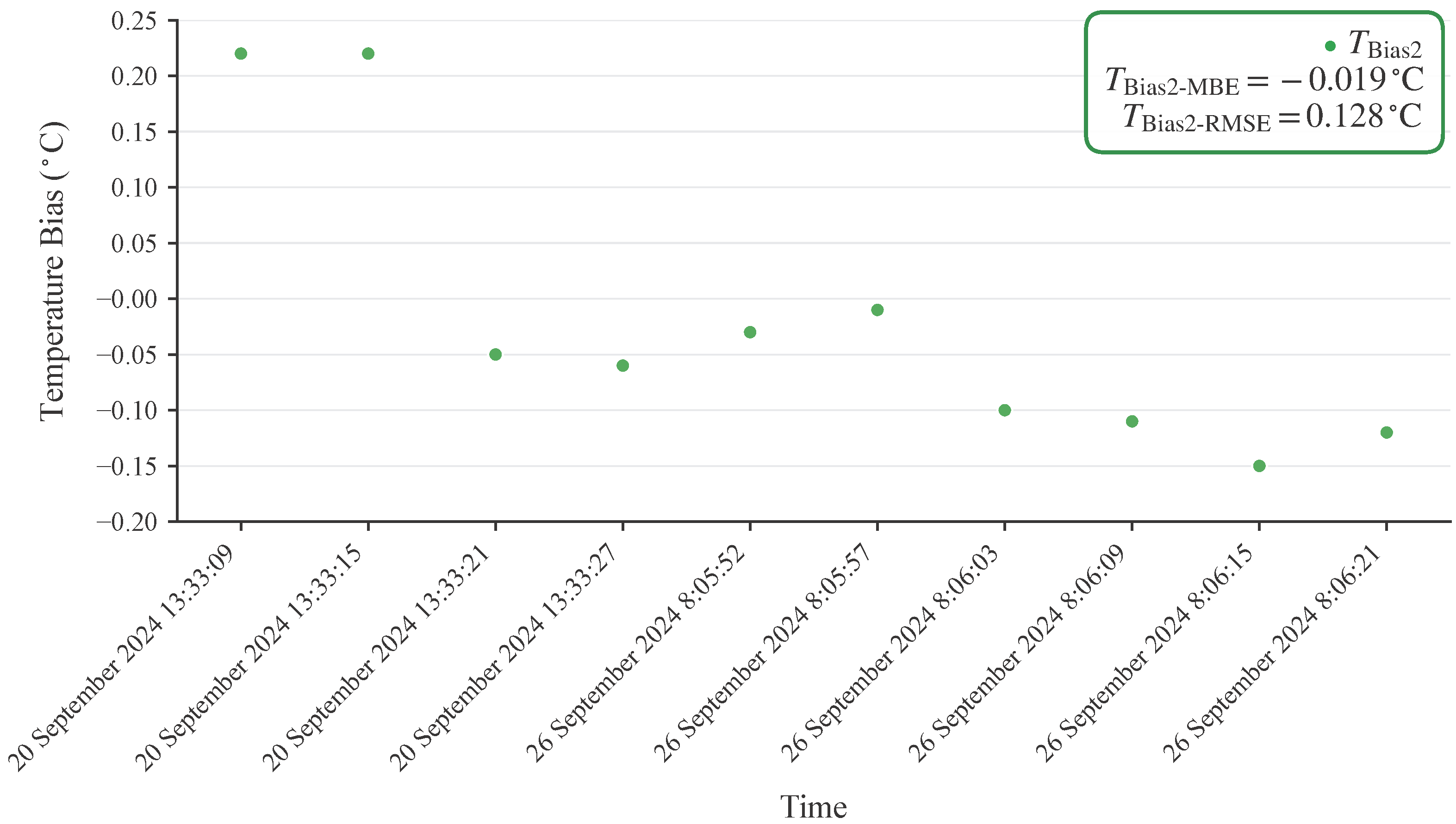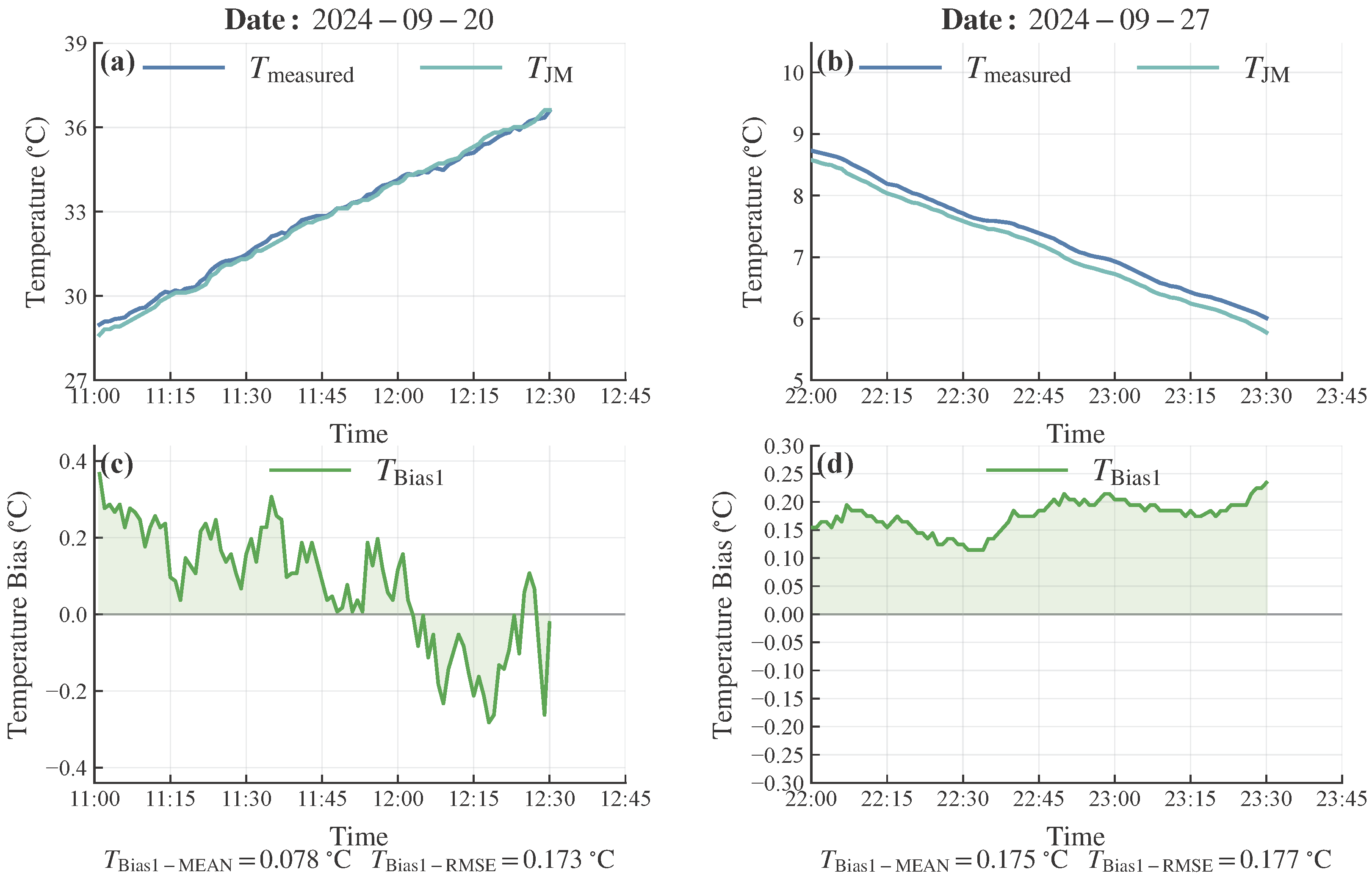 To evaluate the performance of the ground-based contact temperature sensor across different thermal transition regimes, two field comparison experiments were conducted under warming (20 September 2024, 11:00–12:30 local time) and cooling (27 September 2024, 22:00–23:30 local time) conditions. In each experiment, the ground-based contact sensor was compared synchronously with a JM standard thermometer traceable to the National Institute of Metrology of China. The temperature difference time series