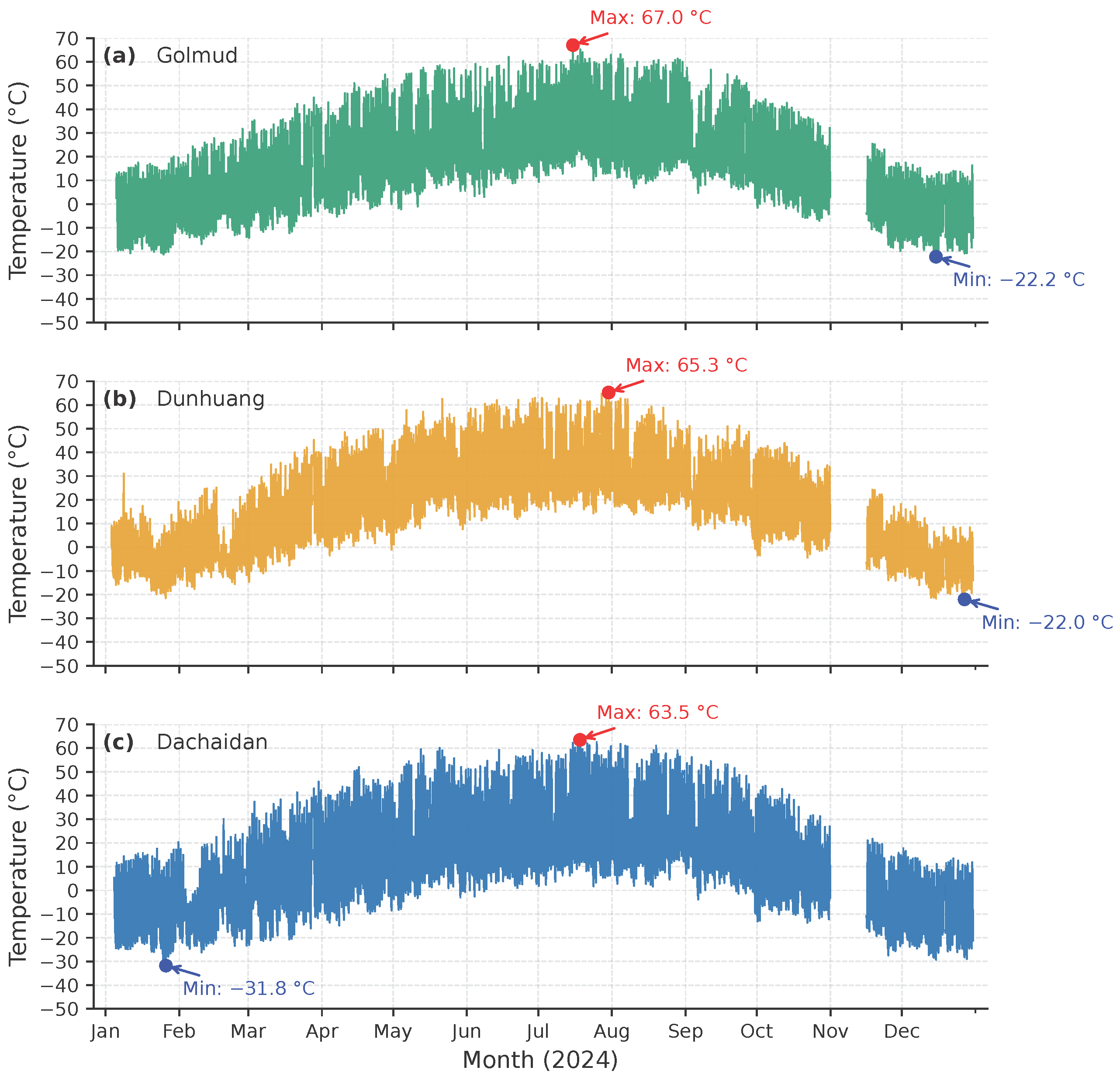 . The annual warmest period occurs in late July, and the coldest temperatures appear in January (Dachaidan) and December (Dunhuang and Golmud), consistent with regional radiative climate characteristics. These seasonal behaviors enable seasonal calibration strategies, with high-temperature calibration in summer and low-temperature calibration in winter.