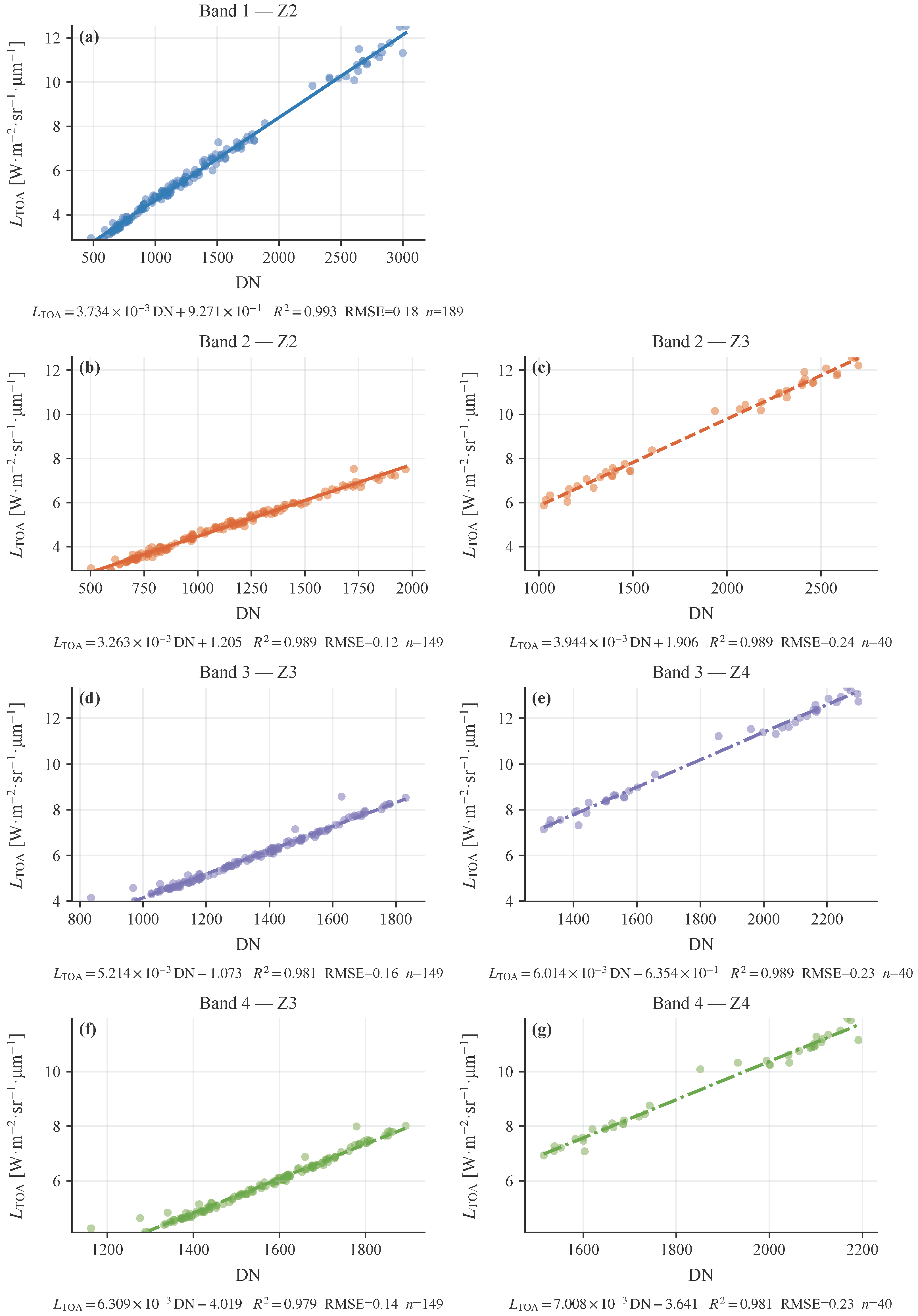 From a channel-by-channel perspective, distinct patterns emerge in sample size n and residual characteristics (RMSE) across gain states. Band 1 under gain mode Z2 exhibits the best overall performance (, RMSE = 0.18, ), indicating a favorable signal-to-noise ratio and sufficient radiance coverage, making it the most stable channel in the current calibration framework. Band 2 demonstrates excellent cross-gain consistency between Z2 and Z3, with identical coefficients of determination () and RMSE values of 0.12 and 0.24 (). This suggests that transitioning between gain states does not introduce systematic response deviations and that the linear relationship remains portable and internally consistent.