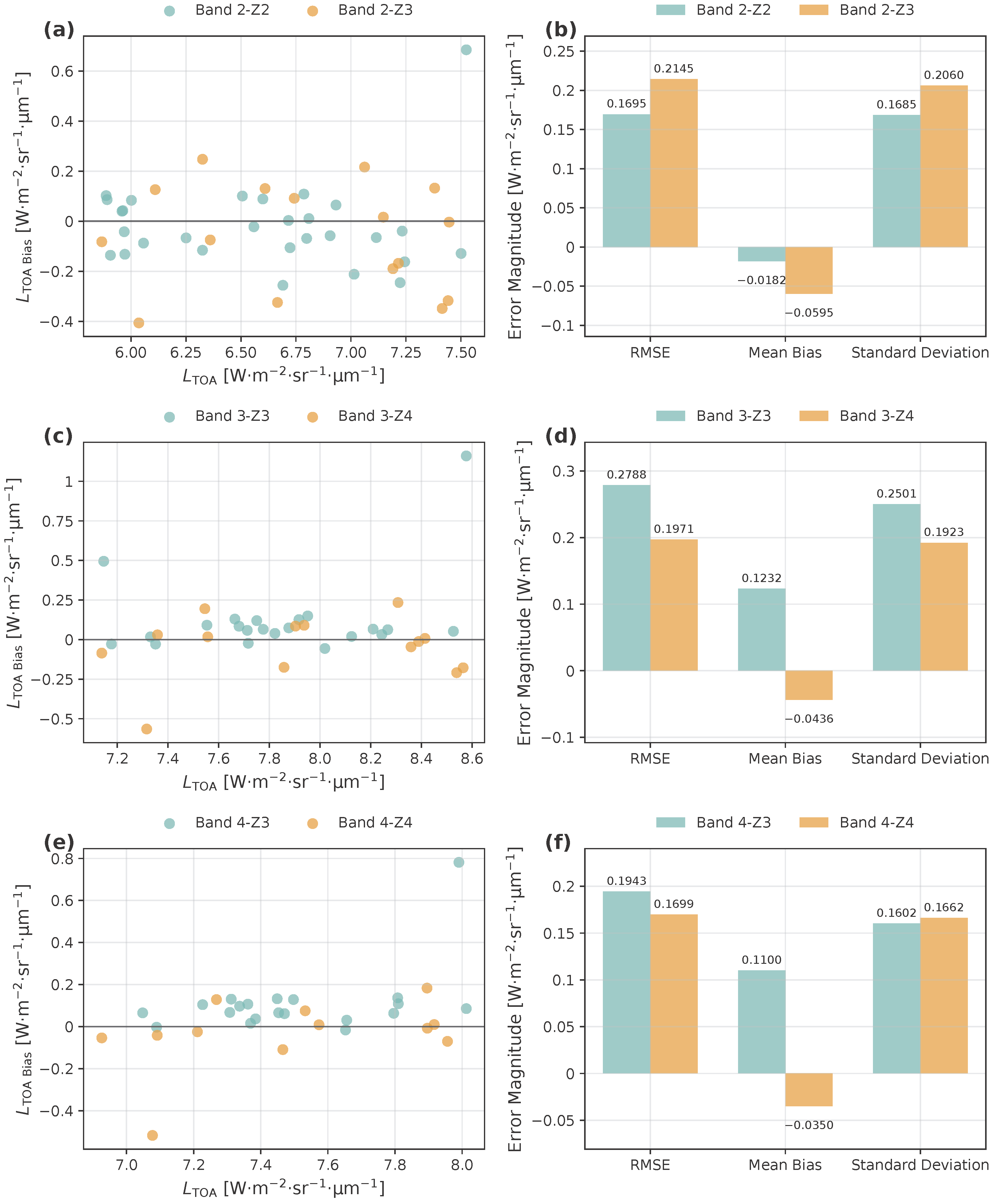 Across-band comparisons reveal distinct cross-mode behaviors. For Band 2, gain mode Z2 shows a clear statistical advantage in the overlap region: its , and are 0.1695, 0.0182 and 0.1685, respectively, all lower than the corresponding values for Z3 (0.2145, 0.0595 and 0.2060). Under the current calibration model and sample distribution, this indicates that the calibration samples for Band 2 provide denser coverage on the low-radiance side (e.g., nighttime or low-temperature conditions), so that the linear fit and noise characteristics in this radiance interval are better constrained. Since Z2 is typically used for lower-radiance observations, the present dataset suggests that low-brightness samples exert a stronger constraint on the Z2 calibration parameters, leading to smaller apparent errors and higher stability for this gain mode under the current calibration setup.