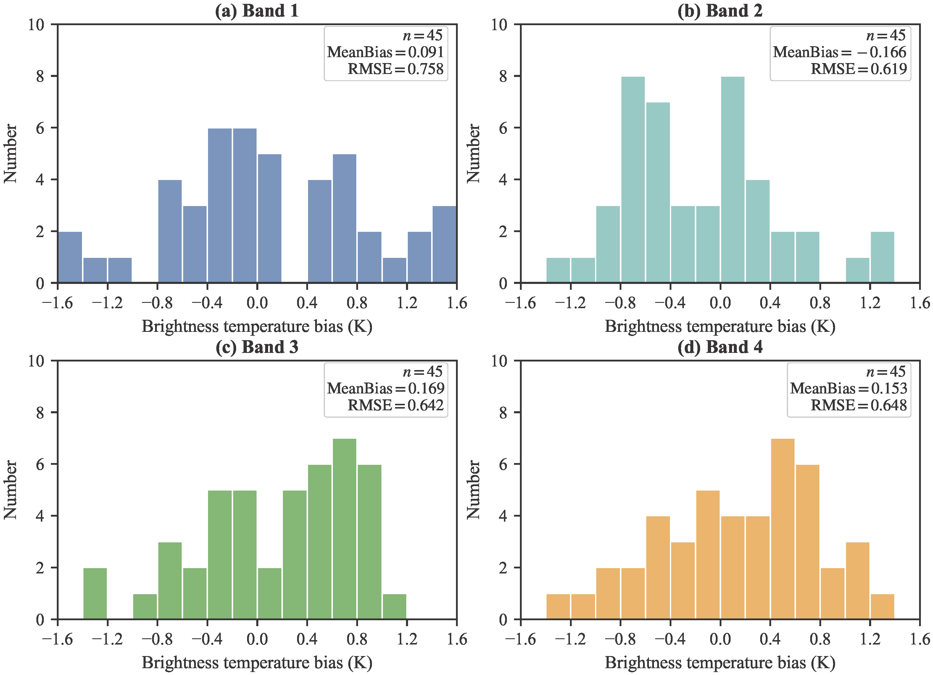 for all bands, and the maximum RMSE does not exceed 0.76 K, indicating that the calibration results achieved in this study are both accurate and reliable. The error distributions for each channel are relatively compact, further demonstrating that the calibration model remains stable and that the retrieval uncertainties are well controlled.