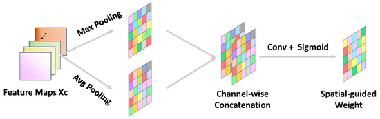 where , n and y denote the input feature maps, and the total numbers of input feature maps and outcome of the Pooling, respectively. Furthermore, is a parameter used to control pooling behavior, and here, in this study, we set . Similar to conventional channel attention mechanisms, we compute Equation (10) over the spatial dimensions.