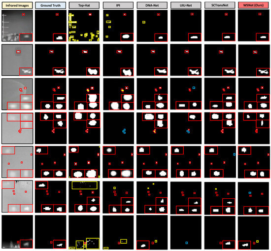 In this subsection, we compare our proposed WSNet model to nine traditional methods—Top–Hat [7], Max–Median [8], WSLCM [12], TLLCM [11], IPI [13], NRAM [14], RIPT [15], PSTNN [16], and MSLSTIPT [17]—as well as nine state–of–the–art (SOTA) deep learning–based methods, including ISNet [21], DNA–Net [20], UIU–Net [6], AGPCNet [23], MTU–Net [22], MSHNet [24], SCTransNet [28], BGM [29], and HFMNet [30].
