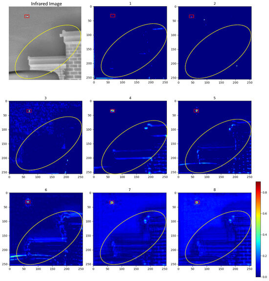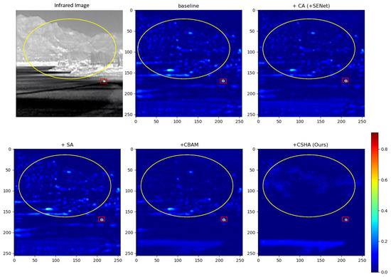 Impact of the Design Choice of CSHA. As shown in Table 7, we conduct ablation experiments to evaluate the effectiveness of different design choices for the CSHA module, including the selection of the parameter p in Lp pooling. The baseline model, which does not include the CSHA module, exhibits inferior performance. Adding either channel attention (CA) or spatial attention (SA) individually improves performance, with each component playing a distinct role: CA suppresses irrelevant regions by modulating channel–wise contributions, while SA directs spatial attention toward discriminative local features, thereby reducing the likelihood of missed detections. Furthermore, compared to the widely used CBAM—which relies on Max and Average Pooling in its channel attention component—our CSHA module adopts Lp pooling for more effective feature aggregation. We also explore the influence of the pooling parameter p, noting that corresponds to Average Pooling and approximates Max Pooling, both of which yield suboptimal results for IRSTD. In contrast, balances the preservation of global feature distribution with robustness to outliers, leading to better overall performance. Visual results in Figure 10 further illustrate that CSHA enhances the saliency of meaningful target regions while suppressing noise that could otherwise trigger false alarms.