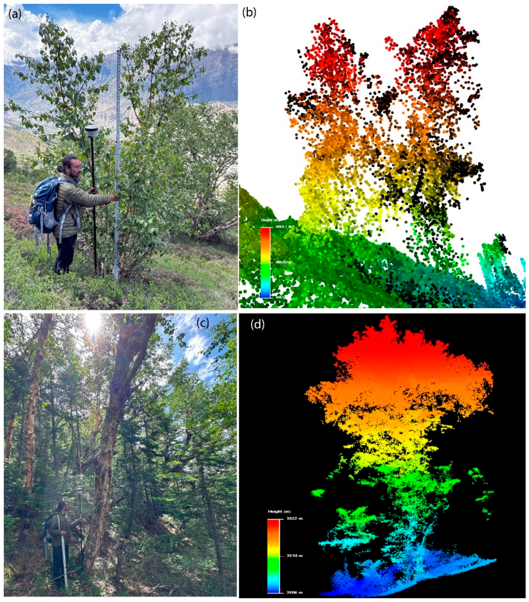 - Das, S.; Basnet, P.; Seidel, D.; Röll, A.; Ehbrecht, M.; Hölscher, D. Tree architecture and structural complexity in mountain forests of the Annapurna region, Himalaya. Ecol. Evol. 2025, 15, e71341. [Google Scholar] [CrossRef]