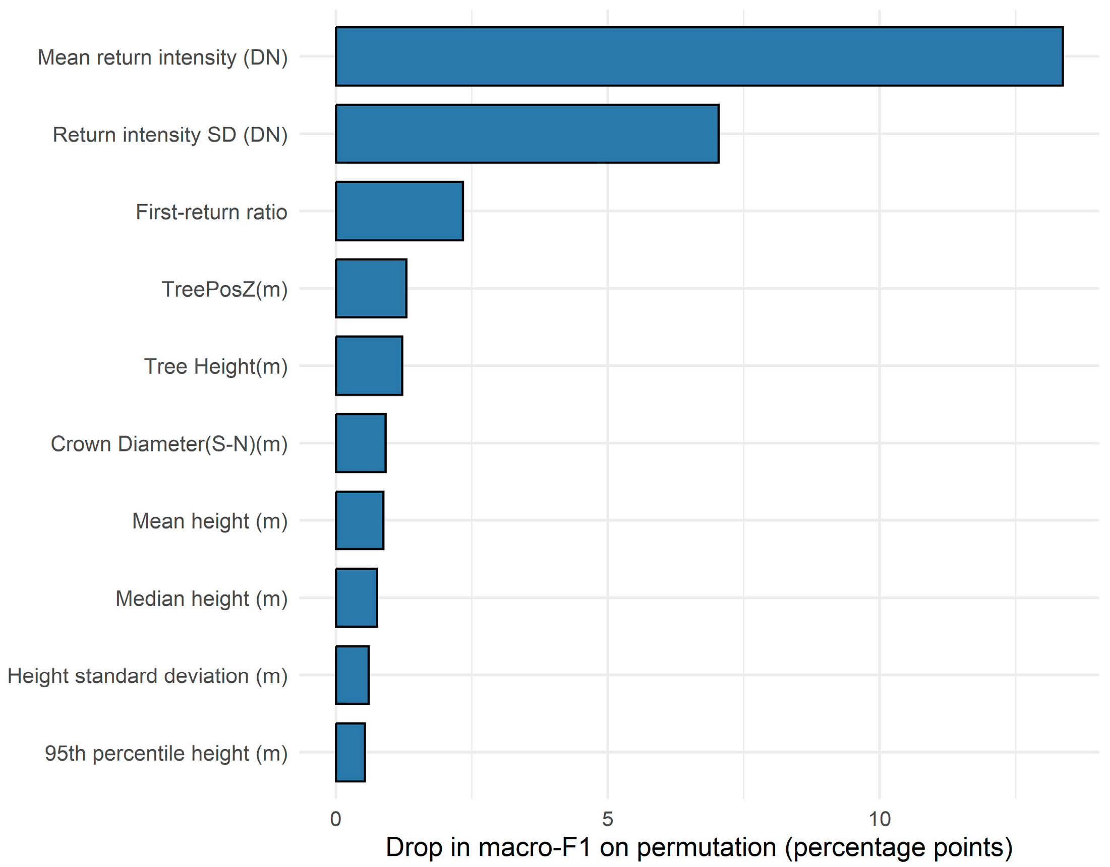 - A random forest classifier using LiDAR-derived structural and intensity metrics achieved high accuracy (>85%) for species identification, with intensity variability emerging as a key predictor.