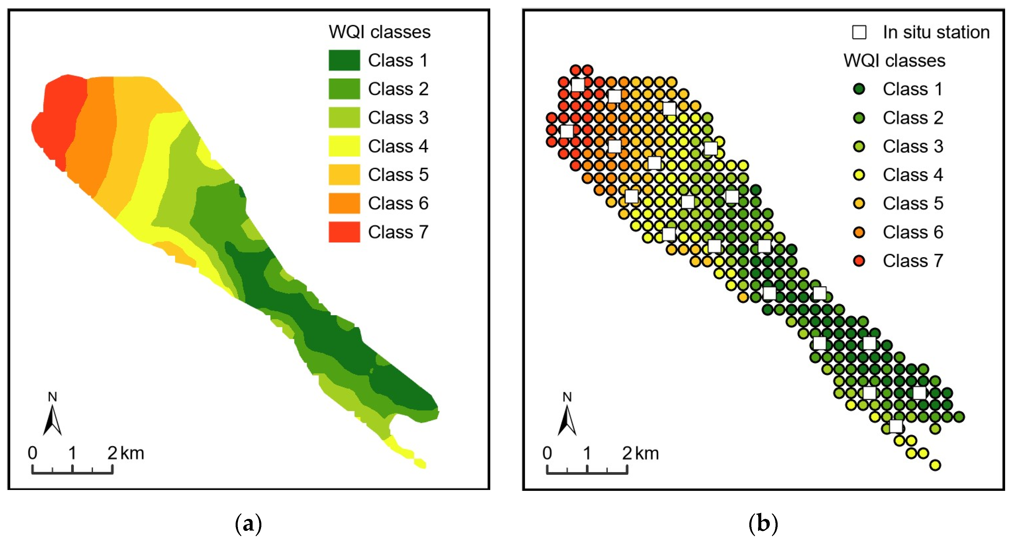 Finally, the one-year temporal offset between the in situ–based WQI modelling and satellite-based prediction may influence model accuracy due to potential domain shifts in key input parameters. Specifically, changes in the minimum and maximum values, distribution characteristics, or inter-parameter relationships driven by differing hydrological, meteorological, or anthropogenic conditions could affect model generalization. Consequently, the spatial predictions presented here are interpreted as a scenario-based extrapolation of lake water quality patterns rather than a strict temporal validation.