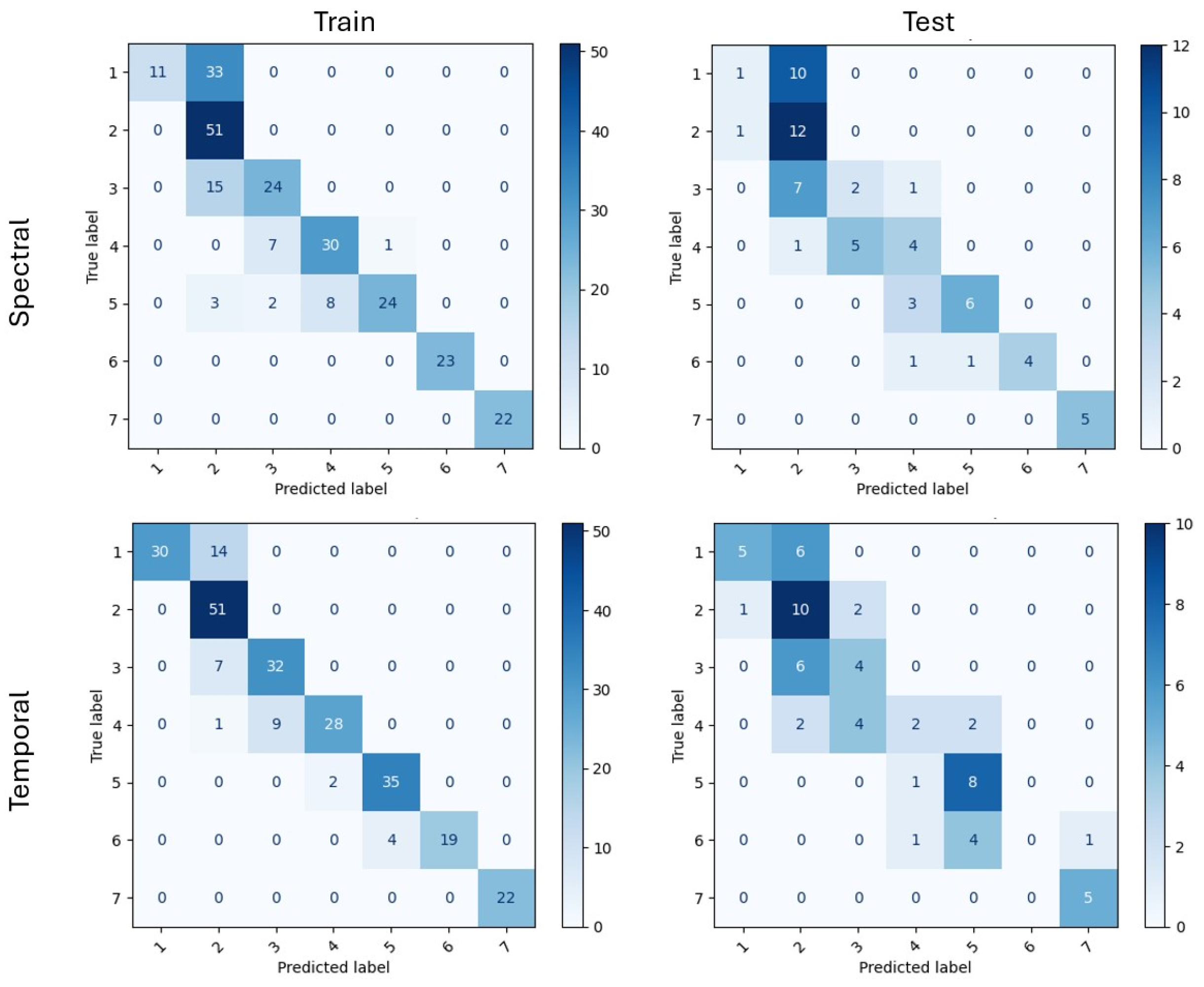 Table 6). The temporal confusion matrix reveals considerable class mixing: several classes show dispersion into multiple neighbouring categories, and true classes 3–5 exhibit notable overlap. Although diagonal structure is still present, class separability is reduced compared with the spectral model. This degradation likely reflects PlanetScope’s limited spectral range combined with day-to-day variations in illumination and atmospheric conditions, which introduce noise into temporal features and reduce their predictive stability.