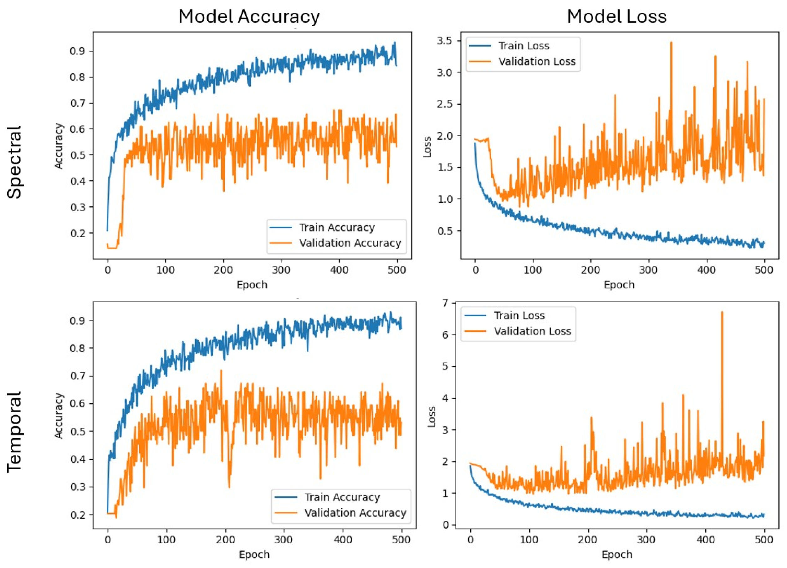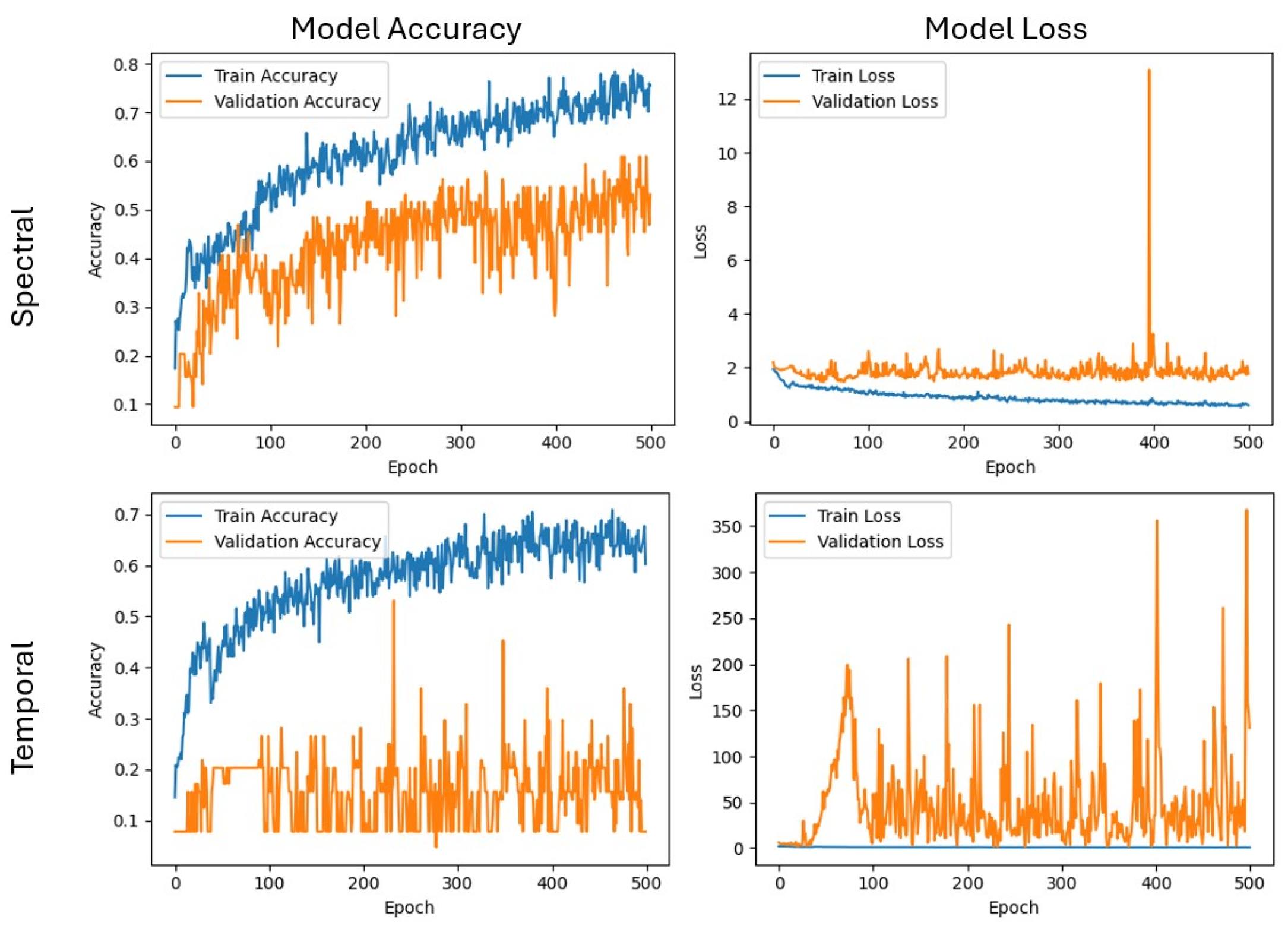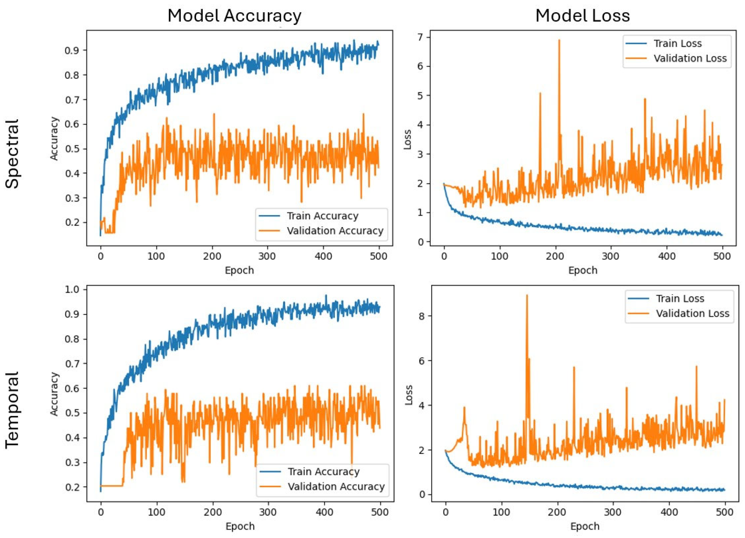 Figure 6). In both configurations, training accuracy increased steadily and reached values above 0.85, accompanied by a consistent decrease in training loss throughout the 500 epochs. Validation accuracy remained lower, fluctuating mostly between 0.45 and 0.60 in both cases, without a strong upward trend. Validation loss showed pronounced variability, including frequent spikes that increased in magnitude at later epochs. These patterns indicate that the model learned stable representations on the training data, while validation performance remained less consistent.