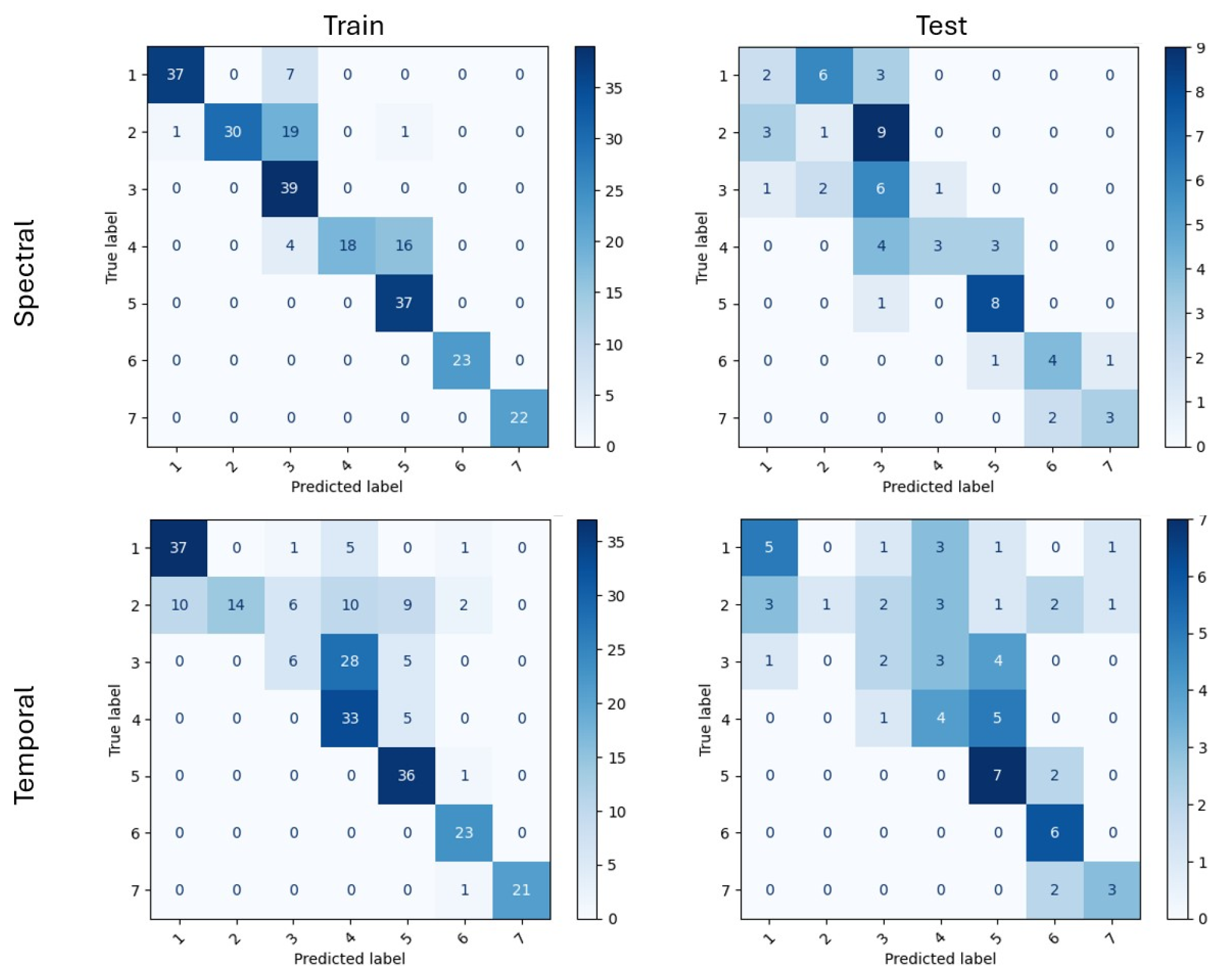 Figure 7), the spectral model showed moderate classification capability, achieving high AUC values (0.98 train, 0.97 test) but only test accuracy of 0.53 (