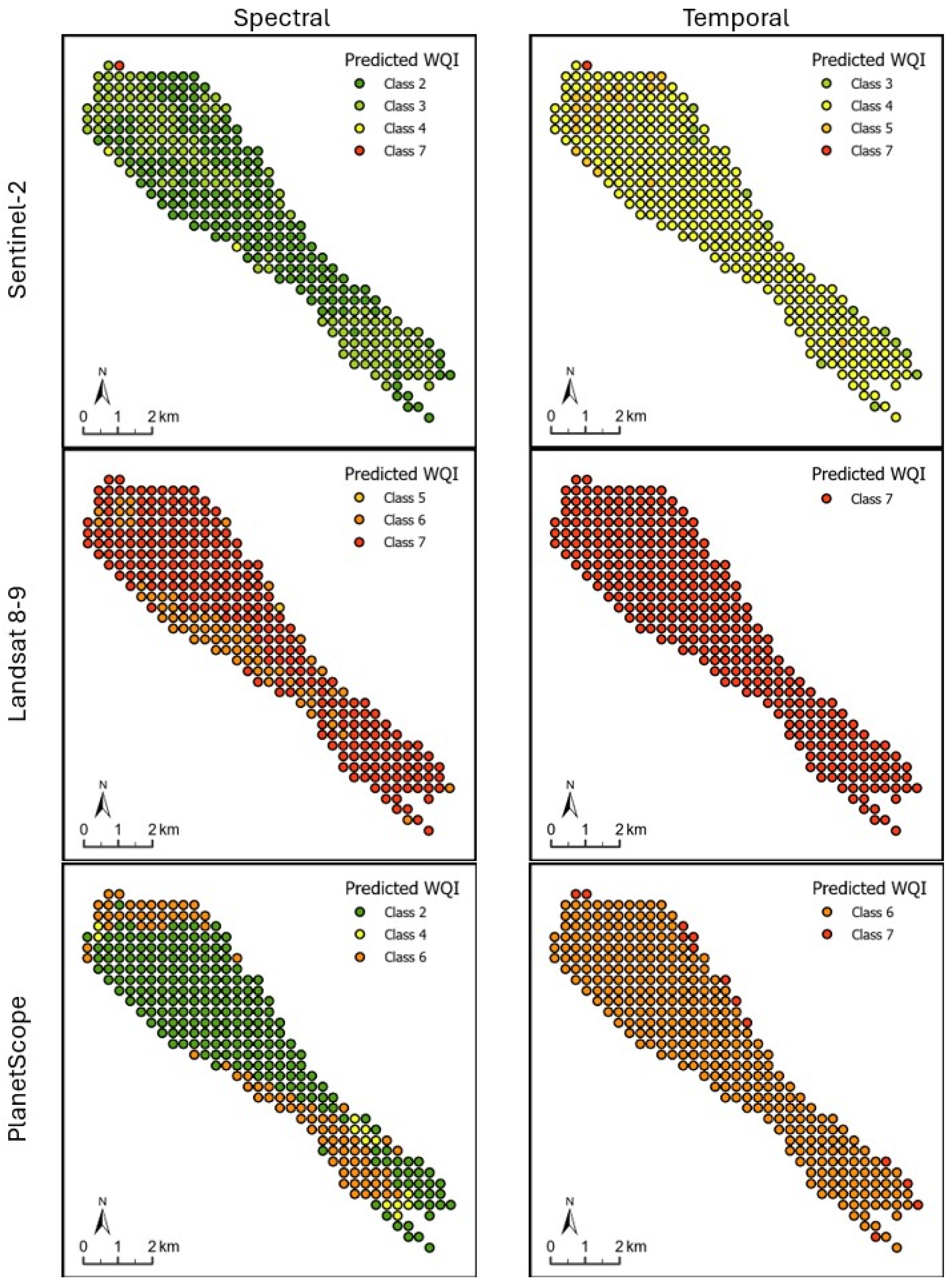 The CNN-based WQI prediction for the year following in situ monitoring period, generated separately for Sentinel-2, Landsat 8–9, and PlanetScope under spectral and temporal model configurations are calculated (