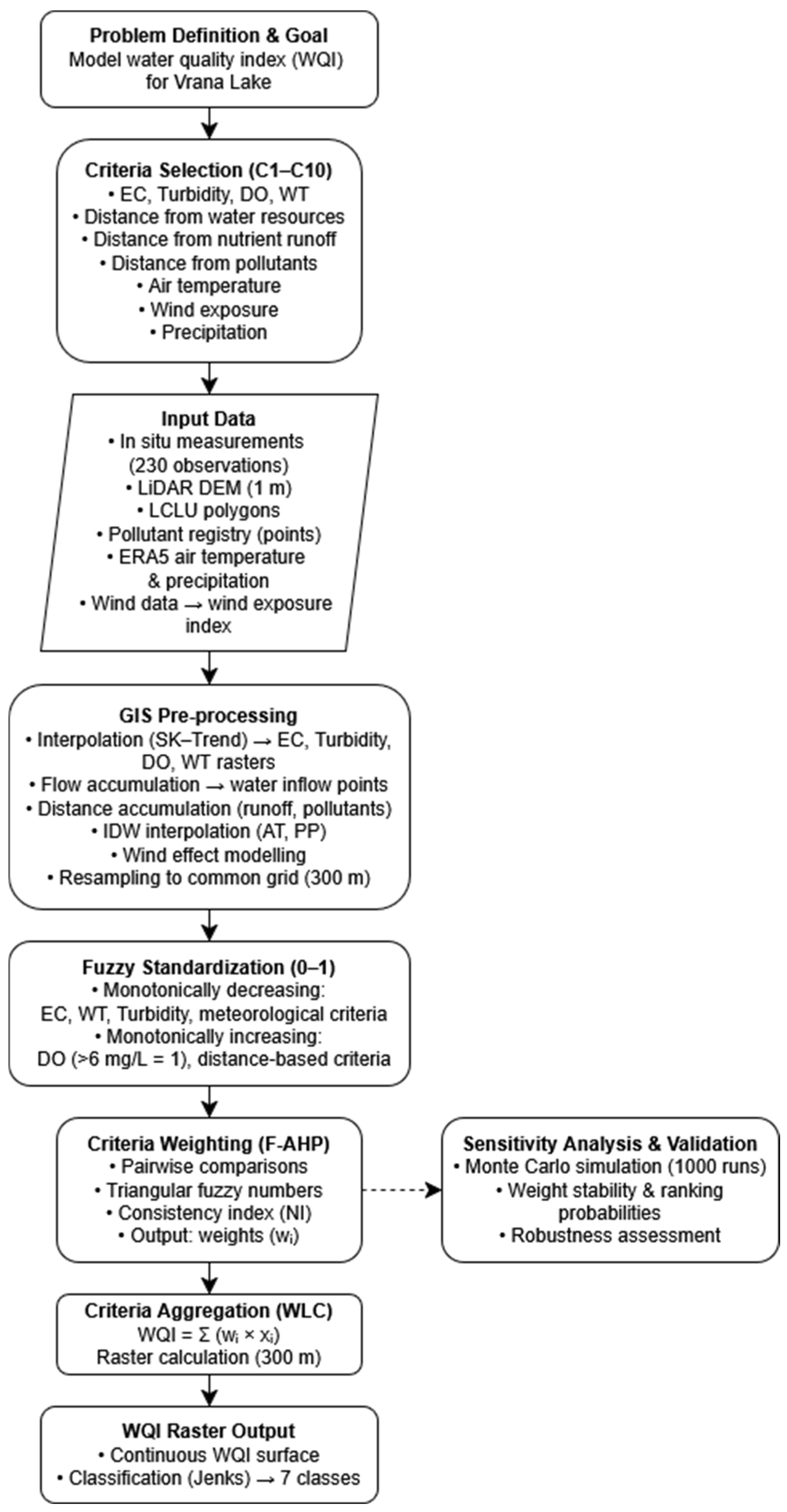 9], where they were identified as dominant drivers of lake water quality dynamics. Their selection was further supported by expert input from the Ruđer Bošković Institute and the Public Institution Vrana Lake Nature Park. Moreover, these parameters constitute the core physicochemical inputs of the GIS–MCDA-based WQI model, whose robustness was validated through sensitivity analysis and Monte Carlo simulations by Batina and Šiljeg (2025) [