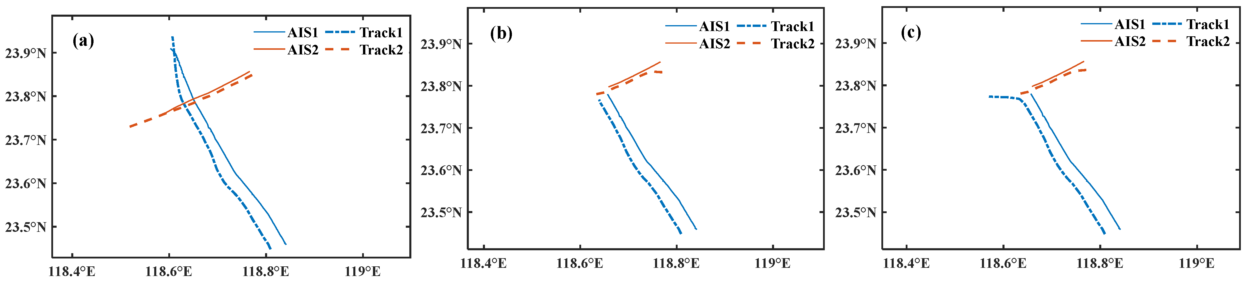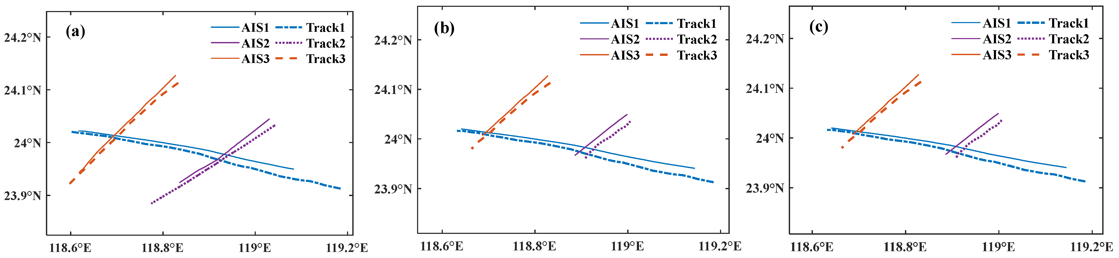 Figure 5b, the NNDA method, relying solely on a single distance metric, was susceptible to track fragmentation due to local optimal solutions. The proposed method, through the complementarity of multiple features, maintains discriminative capability even when the great-circle distance deviates, thereby ensuring track continuity by utilizing features such as the Mahalanobis distance. Furthermore, in areas where vessels sailed steadily, the directional cosine feature effectively distinguished targets with similar current motion directions but different historical courses, significantly reducing the number of false tracks. The results of Case 3 demonstrate that even when detection points are lost in multi-target intersecting scenarios, the proposed algorithm can still generate tracking trajectories for targets while reducing the number of fragmented trajectories. As shown in
