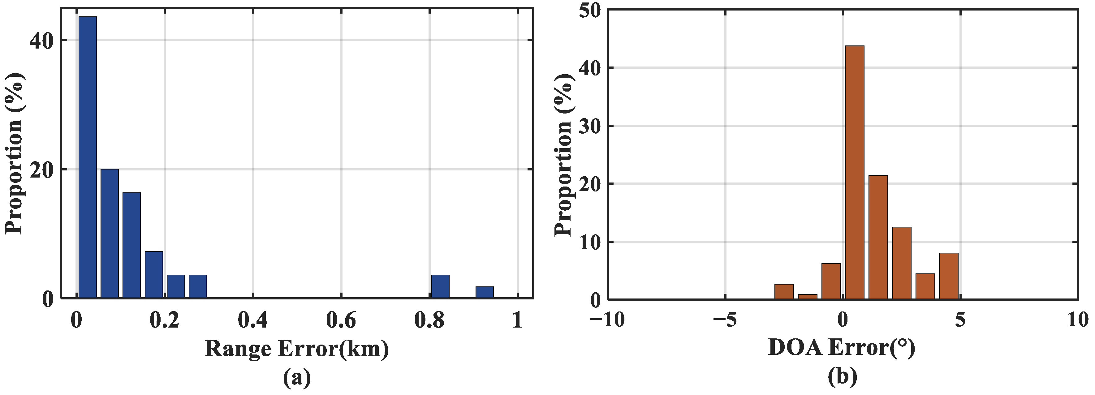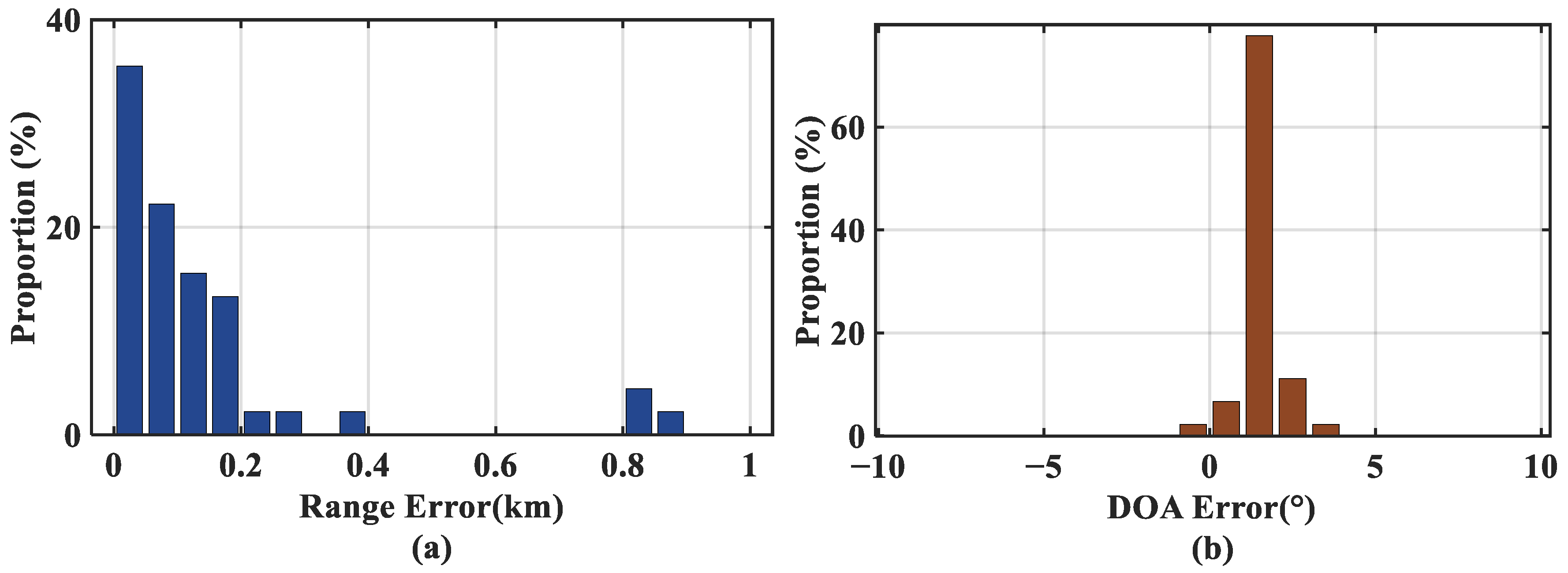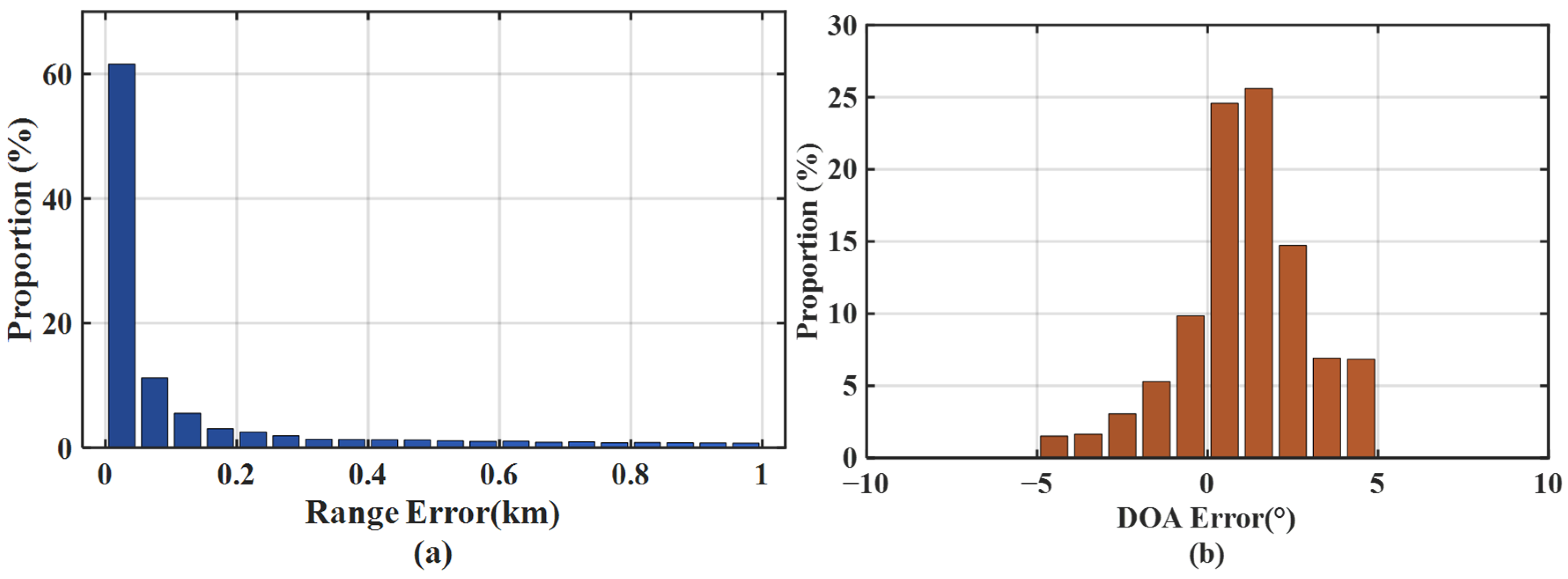 Figure 6. The distance errors primarily distributed within 0–0.2 km, with a mean distance error of 0.14 km and distance RMSE of 0.25 km, with an average DOA error of 1.70° and an DOA RMSE of 1.80°.