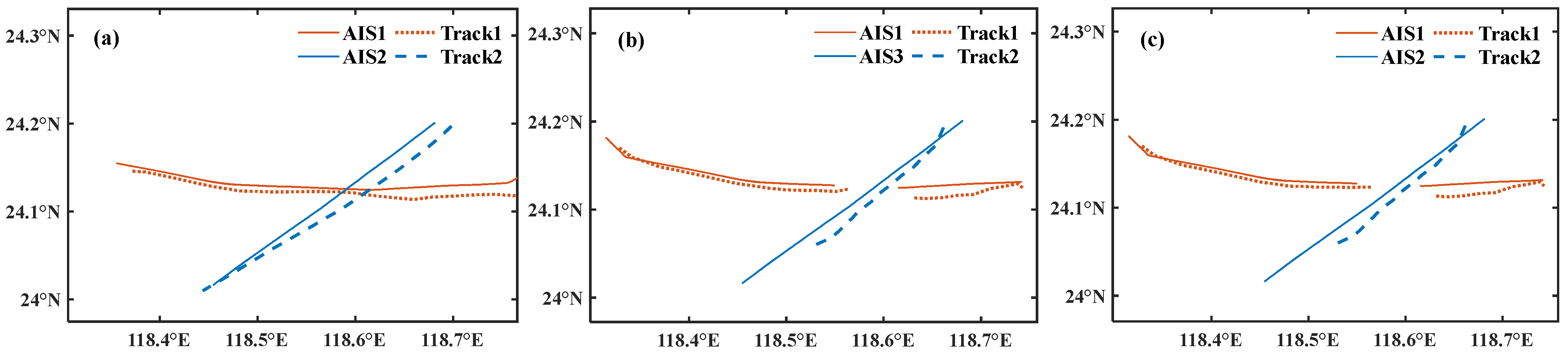 Figure 2, both the NNDA and PDA were disrupted by Ship 1 during tracking of Ships 2 and 3, resulting in trajectory interruptions.