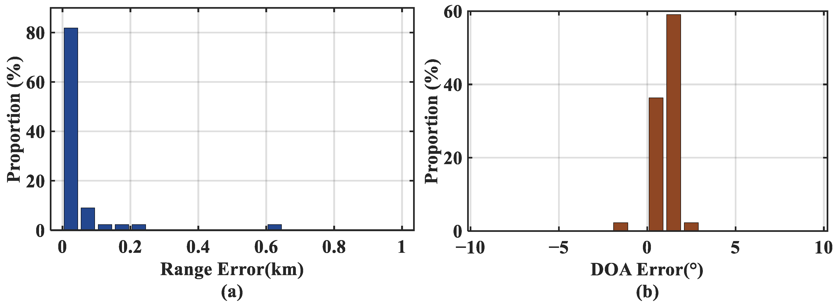 Figure 4, distance errors primarily distributed within 0–0.3 km, with a mean distance error of 0.12 km and distance RMSE of 0.23 km, with an average DOA error of 1.27° and DOA RMSE of 1.98°. This demonstrates that the proposed algorithm achieves both enhanced trajectory tracking continuity and high tracking accuracy.