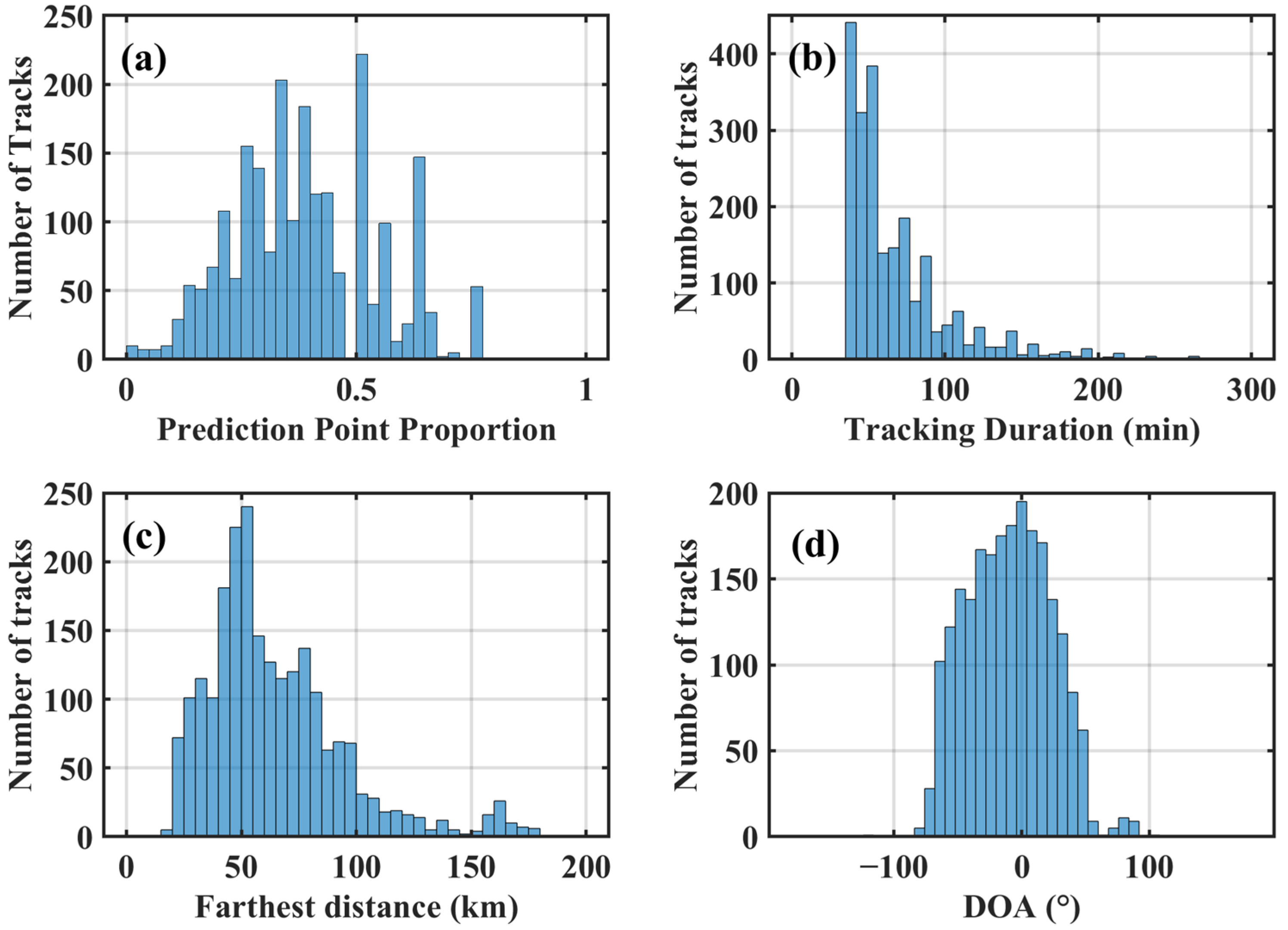 Figure 9b. Most trajectories have durations distributed between 40 and 90 min. During the three-day experiment, nearly 100 trajectories were tracked for over 100 min, with the longest tracking duration reaching 285 min. The maximum detection range of the trajectories obtained by the proposed algorithm was statistically analyzed, as shown in
