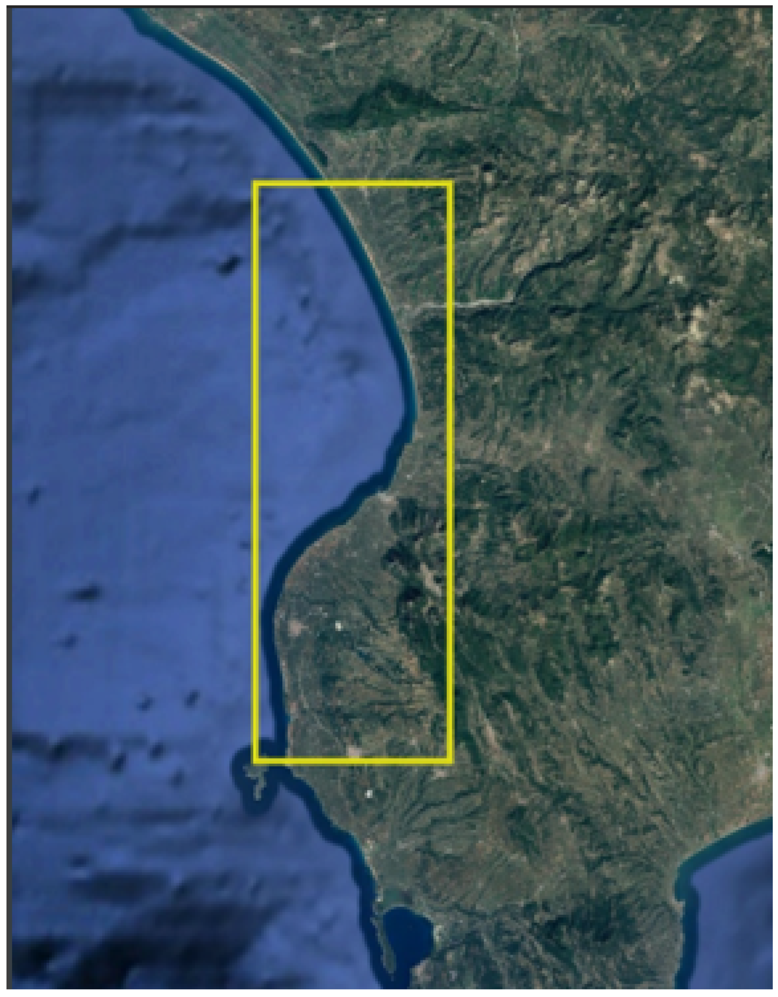 The pilot site selected for this study lies along the southwestern coastal zone of the Peloponnese, Greece, specifically bordering the Kyparissiakos Gulf. The study area extends approximately 60 km along the shoreline and reaches up to 300 m inland (