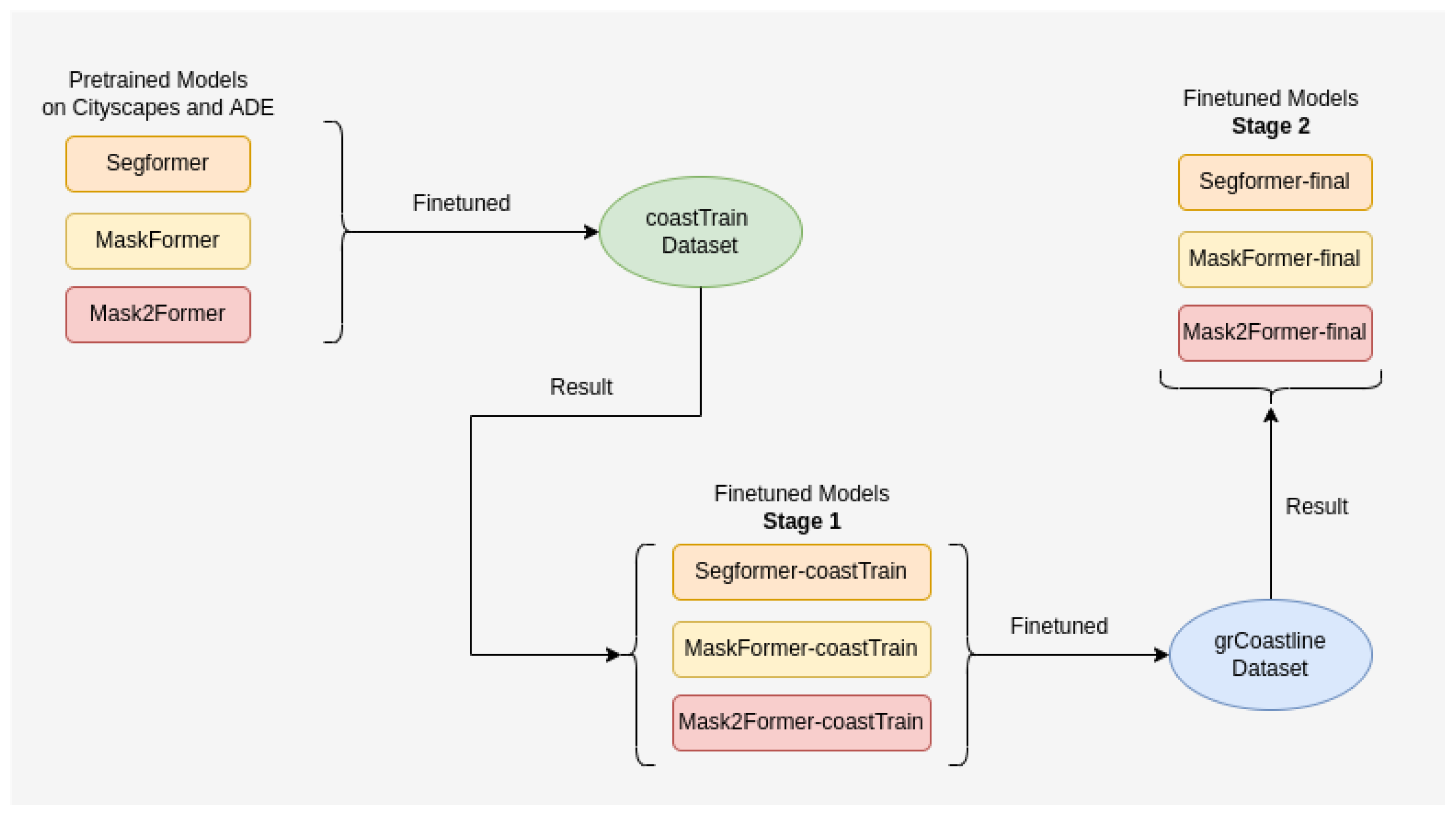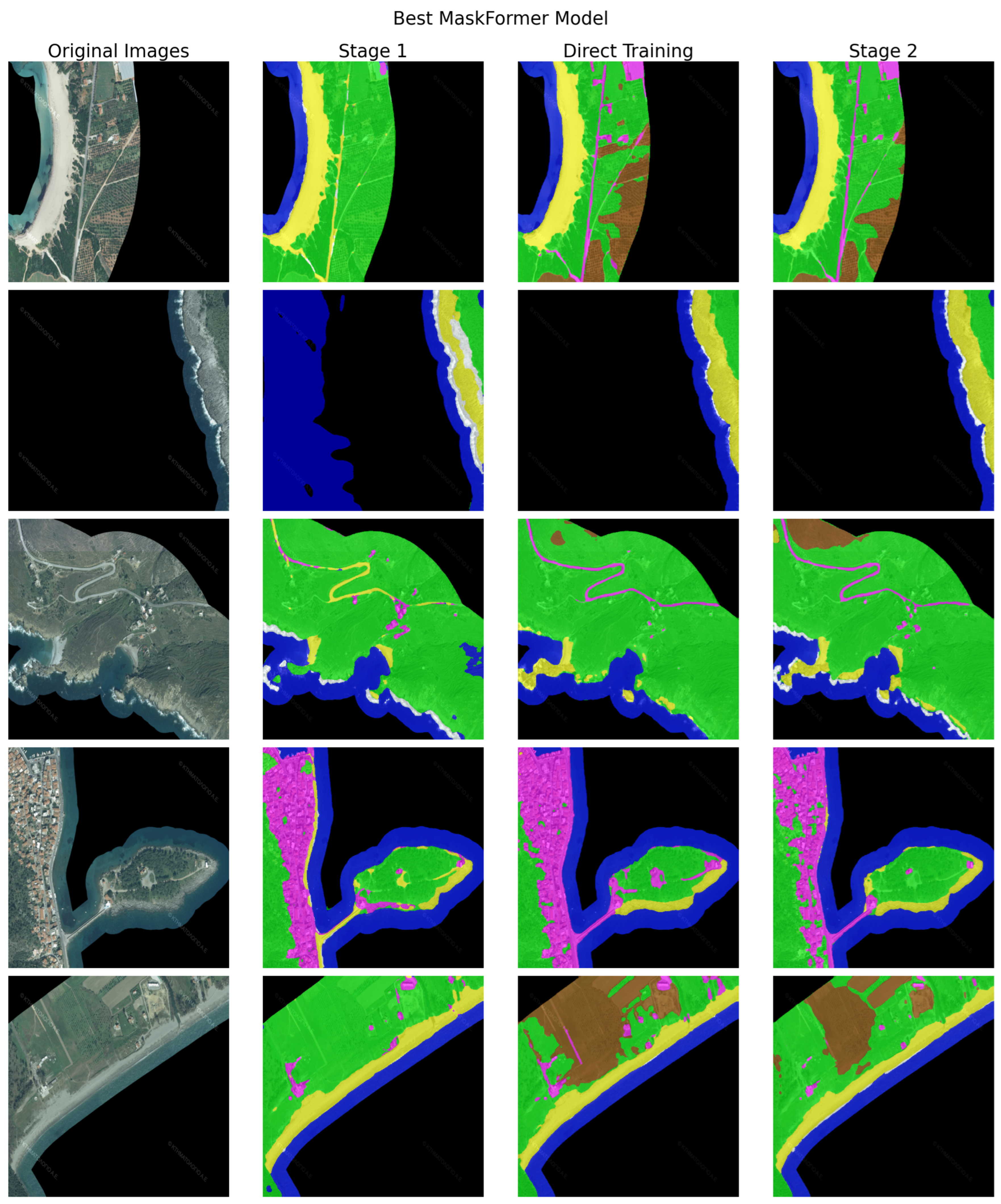 This section presents a comprehensive evaluation of the proposed two-stage training pipeline across three transformer-based architectures—SegFormer, MaskFormer, and Mask2Former. Models were first fine-tuned on the Coast Train dataset (Stage 1) and subsequently adapted to the Greek Coastline dataset via targeted fine-tuning (Stage 2). Performance is reported using mean Intersection over Union (mIoU), mean accuracy, and F1 score. We additionally evaluate a baseline condition in which models are trained directly on the Greek Coastline dataset without Stage 1 pretraining.