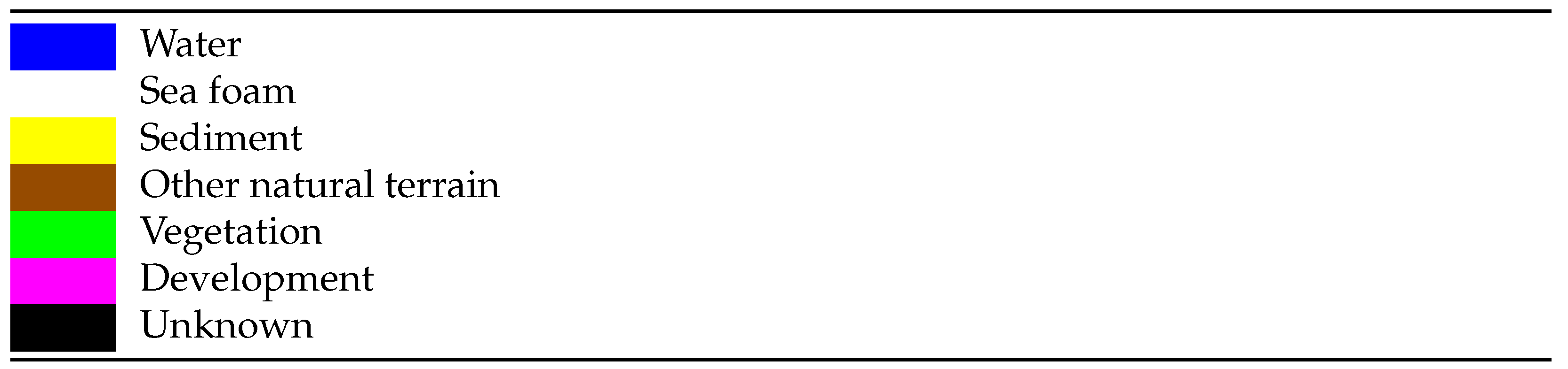 Table 1). Special care was taken to accurately capture transitional shoreline zones—areas where automated models typically struggle due to fine-grained boundaries or mixed surface types.