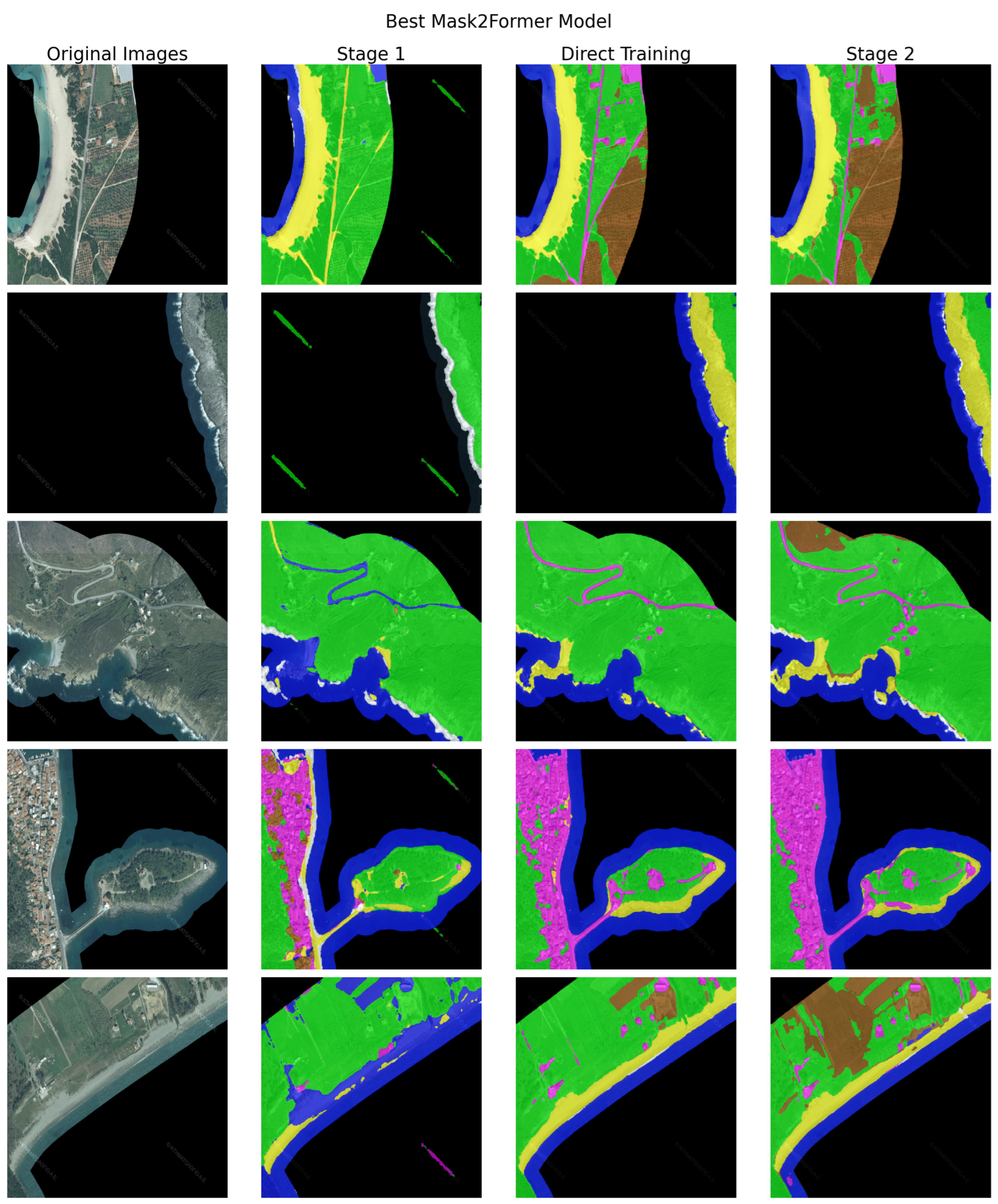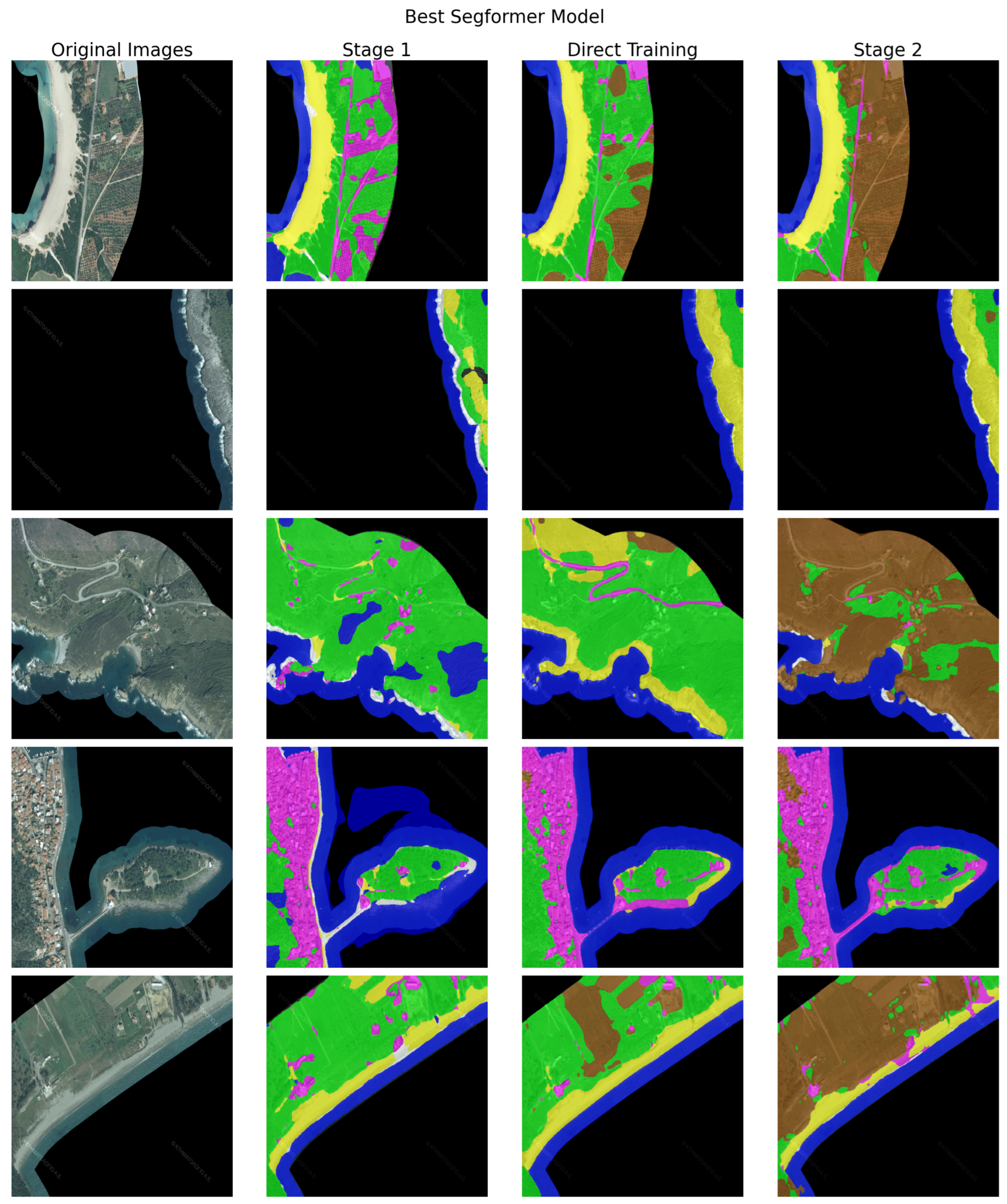 The reduced performance of direct training compared to the Stage 1 results (82.42% vs. 84.06% for Mask2Former) demonstrates the value of large-scale pretraining on diverse coastal imagery. The limited size of the Greek dataset (420 patches) is insufficient for models to learn robust coastal representations from scratch, even when initialized with general-purpose weights from Cityscapes or ADE20K.