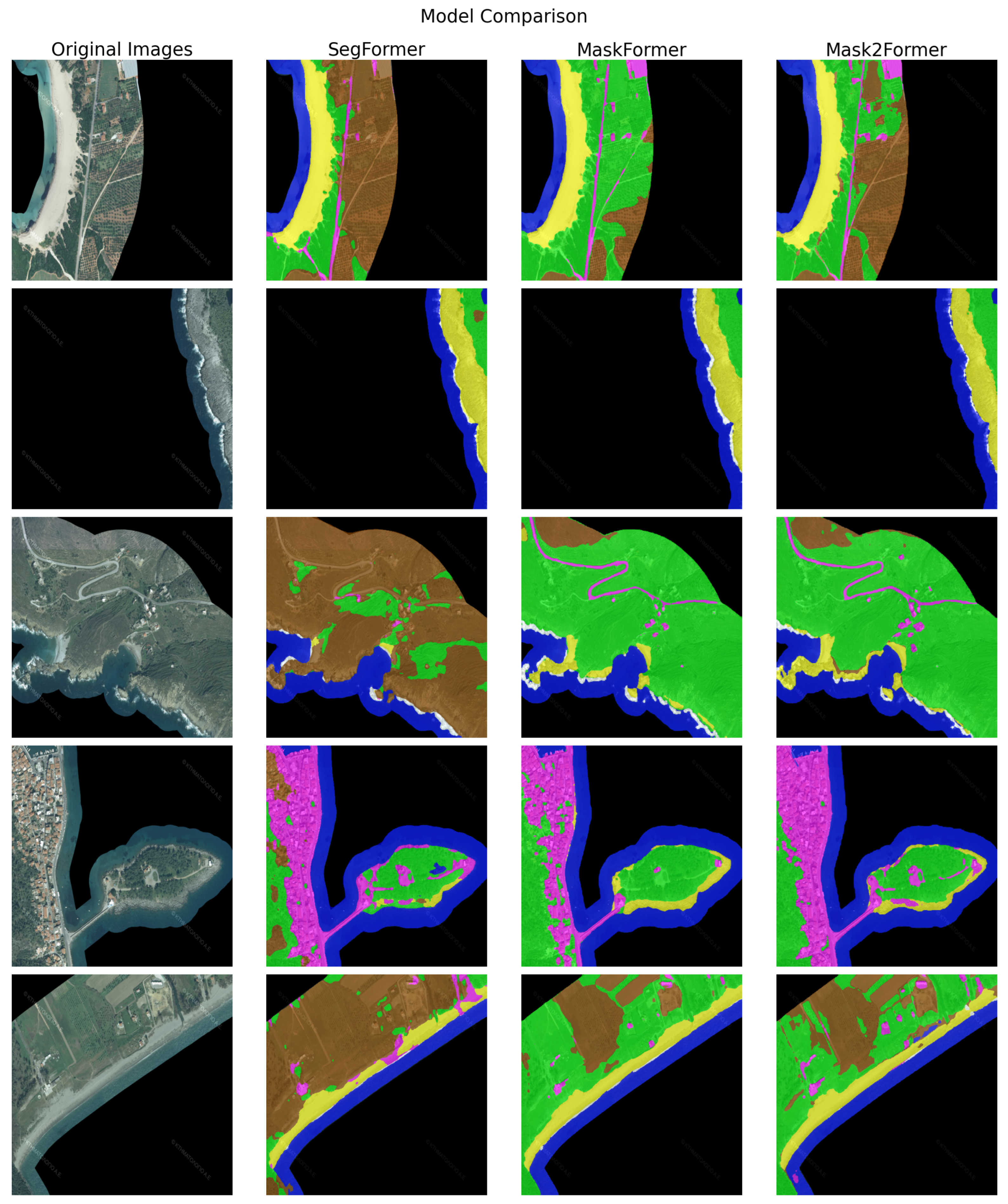 In this study, we implement and compare three Transformer-based semantic segmentation models, SegFormer, MaskFormer, and Mask2Former, to evaluate their suitability for coastal remote sensing applications. Coastal environments are characterized by strong spatial heterogeneity, elongated linear structures, and gradual transitions between land and water, which pose challenges for traditional pixel-based and local-context models. The self-attention mechanism employed by Transformer architectures enables the modeling of long-range dependencies while preserving fine-scale spatial details, making these models particularly well suited for complex coastal scenes.