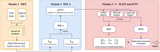With the rapid advancement of spaceborne observation technologies, the availability of multi-source Earth observation data has grown substantially [1]. Among these, optical and synthetic aperture radar (SAR) imagery are two of the most complementary data sources, providing spectral and structural perspectives of the Earth’s surface. Optical images offer high spatial resolution and rich spectral details, while SAR systems operate independently of illumination and weather, enabling continuous all-weather observation [2]. The complementary characteristics make optical–SAR fusion the basis of applications such as change detection, land cover classification, and disaster monitoring [3,4]. Image registration is the foundation of this multi-modal fusion. The purpose of registration is to geometrically align images obtained from different sensors or at different times [5].