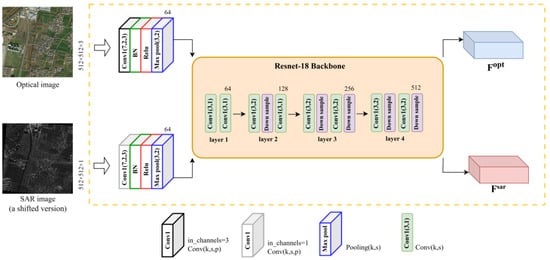 In order to alleviate these problems, this study uses a multi-modal feature extraction (MFE) module based on the ResNet-18 backbone [28]. The module is designed to project the optical and SAR images into a unified high-level semantic feature space so that the discriminant and robust feature representation suitable for cross-modal matching can be extracted.